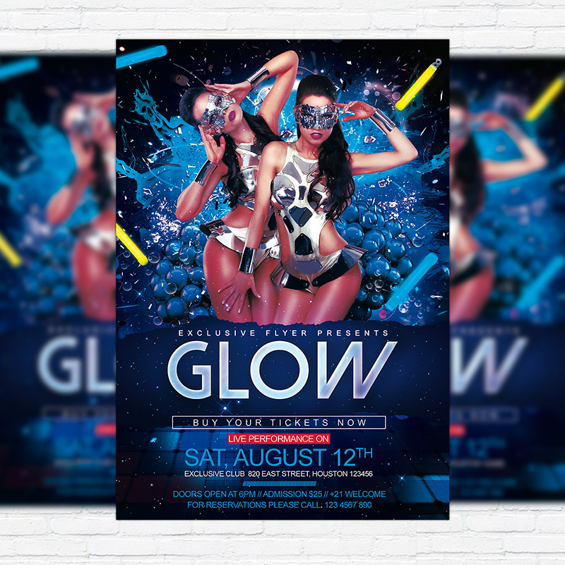 The Glow is the exclusive Photoshop PSD flyer template designed by ExclusiveFlyer to promote your Glow. This is a modern, stylish, blue flyer and just be used for a Neon Night or Glow Party, or Light Party. Dear customers! – you can also: Customize any flyers or Hire Us to create any unique product. Also, you can get unlimited access to all our templates. You can buy 1 month membership, 3 or 6 months membership or even 1 year membership plan and login on site, choose a design, click the button DOWNLOAD TEMPLATE and it’s yours. No hassle, no checkout! When you paid the template, you can find it in your personal account and of course you’ve got a message to your e-mail (maybe in spam) with link to download. Also, you can find all templates, which you buy, in your personal account! All of our flyers have a very good quality (300DPI). And it means that you just need to download one of them and make the necessary modifications such as replace the elements or choose the colors and start to invite your guests! You can order from us design of Banner Ad, Bi-Fold Brochure, Tri-Fold Brochure, Business Card, Logo, One-Sided Flyer, Two-sided Flyer or Postcard. All you need is to checkout and write us all information on our e-mail or skype. (order now). There are a lot of free flyer templates, free business card templates on our site! Also there are a lot of categories of flyers such as club flyers, seasonal flyers, sport flyers and also business flyers. You have a great choise on our site, so good luck! Don’t forget to follow our Facebook community, our page on Twitter, on Pinterest and on Tumblr and leave comments, cause we work for you! PSD is set up in 1275×1875 dimension (4″×6″ with 0,25″ bleed). The PSD file is very well organised, with color coded groups and layers named appropriately. Remember, all stock images of models and other people used only for demonstration all charms of the flyer and don’t included in the download!