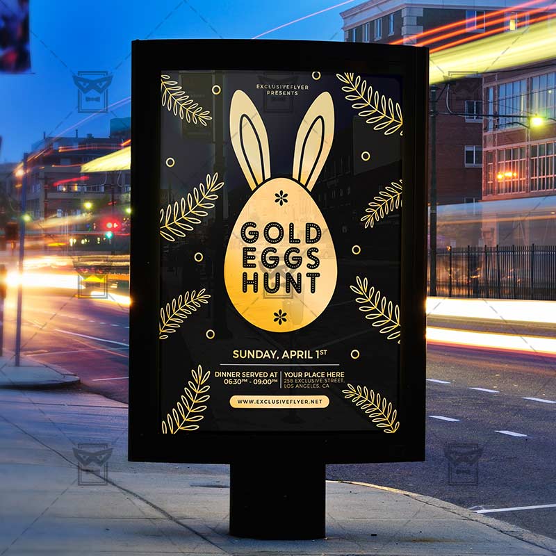 Gold Eggs Hunt is an exclusive PSD flyer template for Adobe Photoshop designed by our best graphic designers to facilitate your task in promoting your business. With our readymade The Easter Celebration flyer in psd format you can invite you customers and guest to your event or to the best Easter Party Night, Easter Celebration, Easter Eggs Hunt or Easter Minimal Party in their lives.