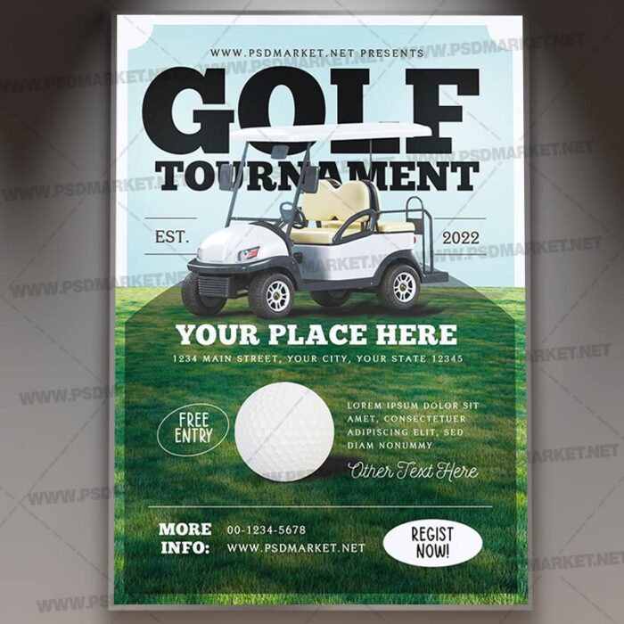 Golf Tournament PSD Template Flyer is a simply modern flyer design by PSDmarket Team to be used with Photoshop CS3 and higher. Save your time and use it for business or for your clients! This can be use for Golf, Golf Game, Golf Tournament, Golf Day, Golf Night, Extreme Sport, Golf Championships and others.