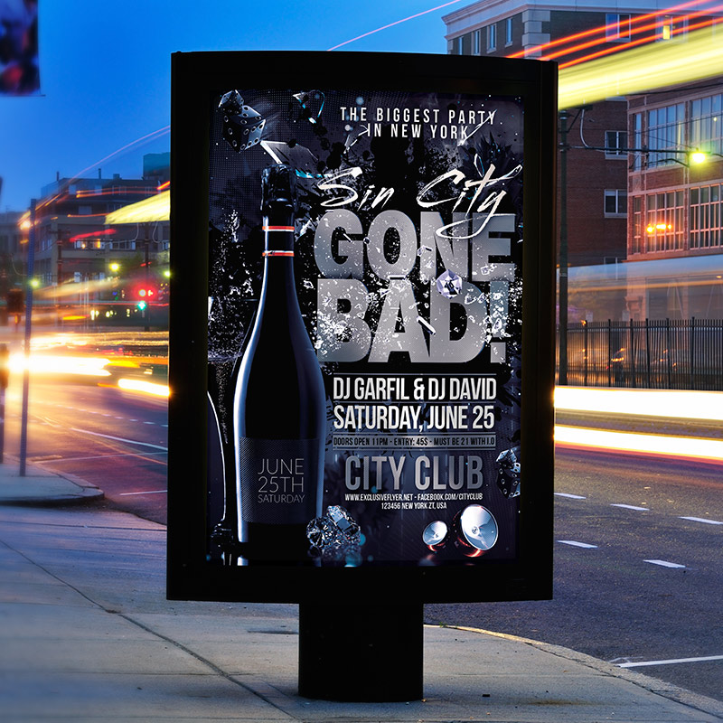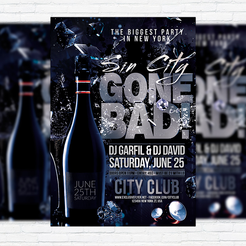 The Gone Bad is the exclusive Photoshop PSD flyer template designed by ExclusiveFlyer to promote your Gone Bad Party. This is a modern, stylish, black flyer and just be used for a Gone Night or Girls Party, or Black Party. Dear customers! – you can also: Customize any flyers or Hire Us to create any unique product. Also, you can get unlimited access to all our templates. You can buy 1 month membership, 3 or 6 months membership or even 1 year membership plan and login on site, choose a design, click the button DOWNLOAD TEMPLATE and it’s yours. No hassle, no checkout! When you paid the template, you can find it in your personal account and of course you’ve got a message to your e-mail (maybe in spam) with link to download. Also, you can find all templates, which you buy, in your personal account! All of our flyers have a very good quality (300DPI). And it means that you just need to download one of them and make the necessary modifications such as replace the elements or choose the colors and start to invite your guests! You can order from us design of Banner Ad, Bi-Fold Brochure, Tri-Fold Brochure, Business Card, Logo, One-Sided Flyer, Two-sided Flyer or Postcard. All you need is to checkout and write us all information on our e-mail or skype. (order now). There are a lot of free flyer templates, free business card templates on our site! Also there are a lot of categories of flyers such as club flyers, seasonal flyers, sport flyers and also business flyers. You have a great choise on our site, so good luck! Don’t forget to follow our Facebook community, our page on Twitter, on Pinterest and on Tumblr and leave comments, cause we work for you! PSD is set up in 1275×1875 dimension (4″×6″ with 0,25″ bleed). The PSD file is very well organised, with color coded groups and layers named appropriately. Remember, all stock images of models and other people used only for demonstration all charms of the flyer and don’t included in the download!