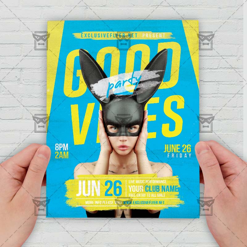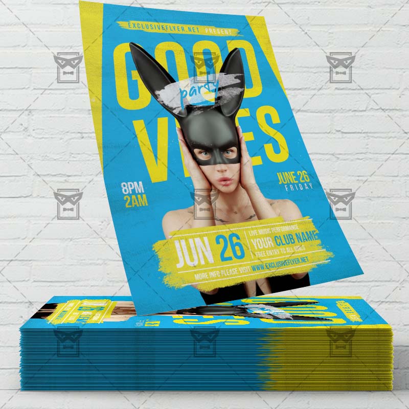 Good Vibes Template an exclusive PSD flyer template for Adobe Photoshop designed by our best graphic designers to facilitate your task in promoting your business. This psd poster/flyer is the best choice for Party Club, Girls Night, Party Online, Girls Night Out Party, Live Show Night, Online Show, Online Dj Battle, Online Party On. With our readymade Good Vibes flyer in psd format you can invite you customers and guest to your event with a minimum of efforts and time.