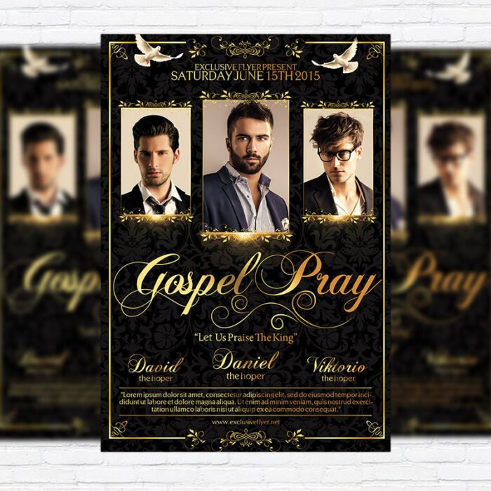 The Gospel Pray is the exclusive Photoshop PSD flyer/poster template designed by ExclusiveFlyer to promote your Gospel Pray. This is a modern, stylish, orange flyer and just be used for a Christian Pray or Gospel Night. Dear customers! – you can also: Customize any flyers or Hire Us to create any unique product. Also, you can get unlimited access to all our templates. You can buy 1 month membership, 3 or 6 months membership or even 1 year membership plan and login on site, choose a design, click the button DOWNLOAD TEMPLATE and it’s yours. No hassle, no checkout! When you paid the template, you can find it in your personal account and of course you’ve got a message to your e-mail (maybe in spam) with link to download. Also, you can find all templates, which you buy, in your personal account! All of our flyers have a very good quality (300DPI). And it means that you just need to download one of them and make the necessary modifications such as replace the elements or choose the colors and start to invite your guests! You can order from us design of Banner Ad, Bi-Fold Brochure, Tri-Fold Brochure, Business Card, Logo, One-Sided Flyer, Two-sided Flyer or Postcard. All you need is to checkout and write us all information on our e-mail or skype. (order now). There are a lot of free flyer templates, free business card templates on our site! Also there are a lot of categories of flyers such as club flyers, seasonal flyers, sport flyers and also business flyers. You have a great choise on our site, so good luck! Don’t forget to follow our Facebook community, our page on Twitter, on Pinterest and on Tumblr and leave comments, cause we work for you! PSD is set up in 1275×1875 dimension (4″×6″ with 0,25″ bleed). The PSD file is very well organised, with color coded groups and layers named appropriately. Remember, all stock images of models and other people used only for demonstration all charms of the flyer and don’t included in the download!