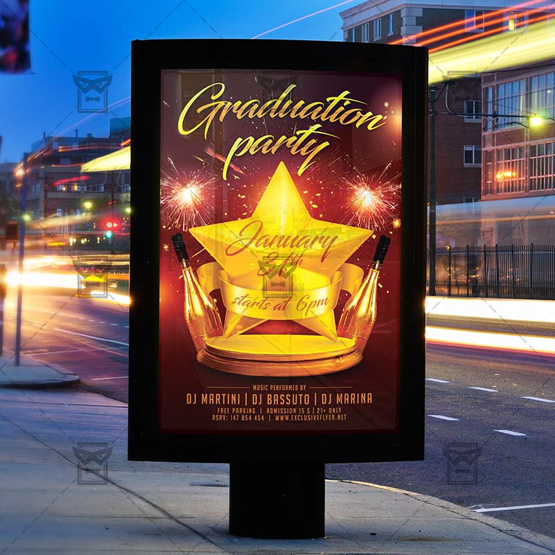 The Graduation Party is the exclusive Photoshop PSD flyer template designed by ExclusiveFlyer to promote your Graduation Party. This is a modern, stylish flyer and just be used for a Graduation Party Night, University Party, Back to School Party etc. Dear customers! – you can also: Customize any flyers or Hire Us to create any unique product. Also, you can get unlimited access to all our templates. You can buy 1 month membership, 3 or 6 months membership or even 1 year membership plan and login on site, choose a design, click the button DOWNLOAD TEMPLATE and it’s yours. No hassle, no checkout! When you paid the template, you can find it in your personal account and of course you’ve got a message to your e-mail (maybe in spam) with link to download. Also, you can find all templates, which you buy, in your personal account! All of our flyers have a very good quality (300DPI). And it means that you just need to download one of them and make the necessary modifications such as replace the elements or choose the colors and start to invite your guests! You can order from us design of Banner Ad, Bi-Fold Brochure, Tri-Fold Brochure, Business Card, Logo, One-Sided Flyer, Two-sided Flyer or Postcard. All you need is to checkout and write us all information on our e-mail or skype. (order now). There are a lot of free flyer templates, free business card templates on our site! Also there are a lot of categories of flyers such as club flyers, seasonal flyers, sport flyers and also business flyers. You have a great choise on our site, so good luck! Don’t forget to follow our Facebook community, our page on Twitter, on Pinterest and on Tumblr and leave comments, cause we work for you! PSD is set up in 1275×1875 dimension (4″×6″ with 0,25″ bleed). The PSD file is very well organised, with color coded groups and layers named appropriately. Remember, all stock images of models and other people used only for demonstration all charms of the flyer and don’t included in the download!