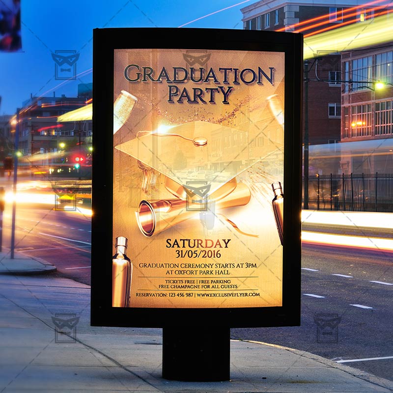 The Graduation Party is the exclusive Photoshop PSD flyer template designed by ExclusiveFlyer to promote your Graduation Party. This is a modern, stylish flyer and just be used for a Back 2 School Party or University Night etc. Dear customers! – you can also: Customize any flyers or Hire Us to create any unique product. Also, you can get unlimited access to all our templates. You can buy 1 month membership, 3 or 6 months membership or even 1 year membership plan and login on site, choose a design, click the button DOWNLOAD TEMPLATE and it’s yours. No hassle, no checkout! When you paid the template, you can find it in your personal account and of course you’ve got a message to your e-mail (maybe in spam) with link to download. Also, you can find all templates, which you buy, in your personal account! All of our flyers have a very good quality (300DPI). And it means that you just need to download one of them and make the necessary modifications such as replace the elements or choose the colors and start to invite your guests! You can order from us design of Banner Ad, Bi-Fold Brochure, Tri-Fold Brochure, Business Card, Logo, One-Sided Flyer, Two-sided Flyer or Postcard. All you need is to checkout and write us all information on our e-mail or skype. (order now). There are a lot of free flyer templates, free business card templates on our site! Also there are a lot of categories of flyers such as club flyers, seasonal flyers, sport flyers and also business flyers. You have a great choise on our site, so good luck! Don’t forget to follow our Facebook community, our page on Twitter, on Pinterest and on Tumblr and leave comments, cause we work for you! PSD is set up in 1275×1875 dimension (4” x 6” with 0,25” bleed). The PSD file is very well organised, with color coded groups and layers named appropriately. Remember, all stock images of models and other people used only for demonstration all charms of the flyer and don’t included in the download!