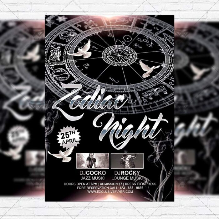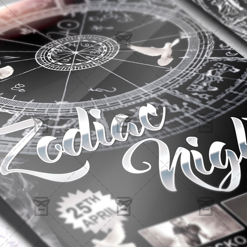 The Zodiac Night is the exclusive Photoshop PSD flyer template designed by ExclusiveFlyer to promote your Zodiac Night Party. This is a modern, stylish flyer and just be used for a Astrology Party or Aguarius Night, Saggitarius Night etc. Dear customers! – you can also: Customize any flyers or Hire Us to create any unique product. Also, you can get unlimited access to all our templates. You can buy 1 month membership, 3 or 6 months membership or even 1 year membership plan and login on site, choose a design, click the button DOWNLOAD TEMPLATE and it’s yours. No hassle, no checkout! When you paid the template, you can find it in your personal account and of course you’ve got a message to your e-mail (maybe in spam) with link to download. Also, you can find all templates, which you buy, in your personal account! All of our flyers have a very good quality (300DPI). And it means that you just need to download one of them and make the necessary modifications such as replace the elements or choose the colors and start to invite your guests! You can order from us design of Banner Ad, Bi-Fold Brochure, Tri-Fold Brochure, Business Card, Logo, One-Sided Flyer, Two-sided Flyer or Postcard. All you need is to checkout and write us all information on our e-mail or skype. (order now). There are a lot of free flyer templates, free business card templates on our site! Also there are a lot of categories of flyers such as club flyers, seasonal flyers, sport flyers and also business flyers. You have a great choise on our site, so good luck! Don’t forget to follow our Facebook community, our page on Twitter, on Pinterest and on Tumblr and leave comments, cause we work for you! PSD is set up in 1275×1875 dimension (4” x 6” with 0,25” bleed). The PSD file is very well organised, with color coded groups and layers named appropriately. Remember, all stock images of models and other people used only for demonstration all charms of the flyer and don’t included in the download!