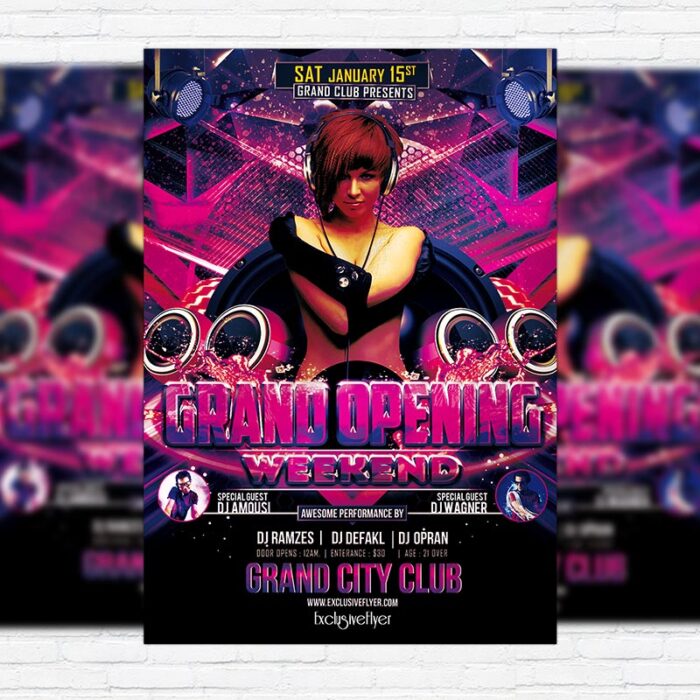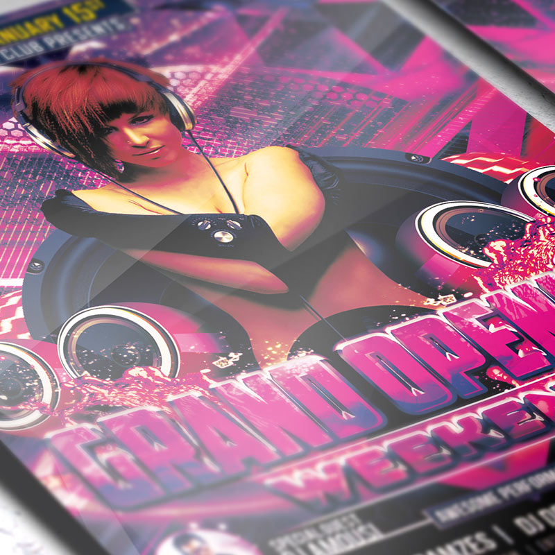 The Grand Opening Weekend is the exclusive Photoshop PSD flyer template designed by ExclusiveFlyer to promote your Grand Opening Weekend. This is a modern, stylish flyer and just be used for a Electro Party or Grand Opening Night. Dear customers! – you can also: Customize any flyers or Hire Us to create any unique product. Also, you can get unlimited access to all our templates. You can buy 1 month membership, 3 or 6 months membership or even 1 year membership plan and login on site, choose a design, click the button DOWNLOAD TEMPLATE and it’s yours. No hassle, no checkout! When you paid the template, you can find it in your personal account and of course you’ve got a message to your e-mail (maybe in spam) with link to download. Also, you can find all templates, which you buy, in your personal account! All of our flyers have a very good quality (300DPI). And it means that you just need to download one of them and make the necessary modifications such as replace the elements or choose the colors and start to invite your guests! You can order from us design of Banner Ad, Bi-Fold Brochure, Tri-Fold Brochure, Business Card, Logo, One-Sided Flyer, Two-sided Flyer or Postcard. All you need is to checkout and write us all information on our e-mail or skype. (order now). There are a lot of free flyer templates, free business card templates on our site! Also there are a lot of categories of flyers such as club flyers, seasonal flyers, sport flyers and also business flyers. You have a great choise on our site, so good luck! Don’t forget to follow our Facebook community, our page on Twitter, on Pinterest and on Tumblr and leave comments, cause we work for you! PSD is set up in 1275×1875 dimension (4″×6″ with 0,25″ bleed). The PSD file is very well organised, with color coded groups and layers named appropriately. Remember, all stock images of models and other people used only for demonstration all charms of the flyer and don’t included in the download!