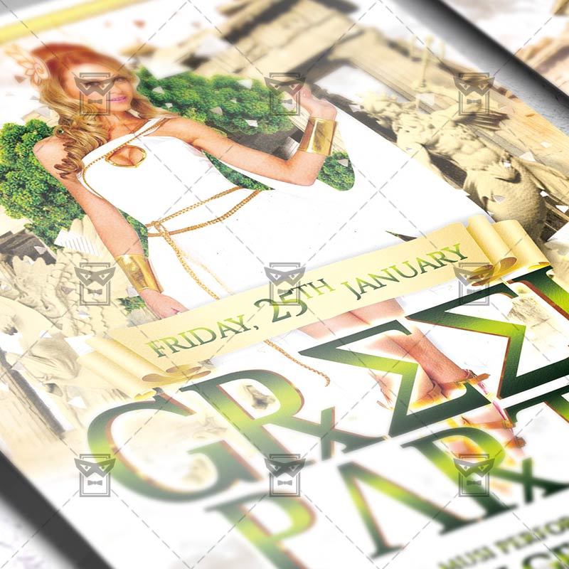 The Greek Party is the exclusive Photoshop PSD flyer template designed by ExclusiveFlyer to promote your Greek Party. This is a modern, stylish flyer and just be used for a Toga Party, Greece Night, Greece Independence Day etc. Dear customers! – you can also: Customize any flyers or Hire Us to create any unique product. Also, you can get unlimited access to all our templates. You can buy 1 month membership, 3 or 6 months membership or even 1 year membership plan and login on site, choose a design, click the button DOWNLOAD TEMPLATE and it’s yours. No hassle, no checkout! When you paid the template, you can find it in your personal account and of course you’ve got a message to your e-mail (maybe in spam) with link to download. Also, you can find all templates, which you buy, in your personal account! All of our flyers have a very good quality (300DPI). And it means that you just need to download one of them and make the necessary modifications such as replace the elements or choose the colors and start to invite your guests! You can order from us design of Banner Ad, Bi-Fold Brochure, Tri-Fold Brochure, Business Card, Logo, One-Sided Flyer, Two-sided Flyer or Postcard. All you need is to checkout and write us all information on our e-mail or skype. (order now). There are a lot of free flyer templates, free business card templates on our site! Also there are a lot of categories of flyers such as club flyers, seasonal flyers, sport flyers and also business flyers. You have a great choise on our site, so good luck! Don’t forget to follow our Facebook community, our page on Twitter, on Pinterest and on Tumblr and leave comments, cause we work for you! PSD is set up in 1275×1875 dimension (4” x 6” with 0,25” bleed). The PSD file is very well organised, with color coded groups and layers named appropriately. Remember, all stock images of models and other people used only for demonstration all charms of the flyer and don’t included in the download!
