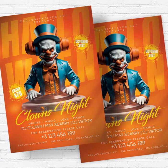This Halloween Clowns Night PSD template is perfect for creating spooky and festive graphics to promote your upcoming Halloween party. The template includes a variety of elements, such as: