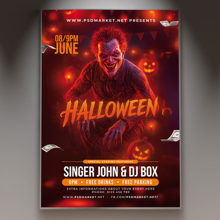 Halloween Party Flyer TemplatePrepare for a night of frights and fun with our chilling **Halloween Party Flyer Template**! This spooky and festive design is perfect for promoting haunted house parties, costume contests, themed club nights, or any gathering that celebrates the most ghoulish night of the year. If you’re looking to create an irresistible invitation that screams “trick or treat,” “boo!,” and “a terrifyingly good time,” this flyer template is engineered to draw a massive and enthusiastic crowd. Expect to see striking visuals, often incorporating classic Halloween elements like carved jack-o’-lanterns, spooky ghosts, crawling spiders, and eerie, gothic typography that captures the macabre and exhilarating spirit of Halloween. This template is all about setting a spine-tingling and high-energy mood, making your “Halloween Party” the ultimate destination for an epic gathering! The **Halloween Party Flyer Template** offers a highly adaptable and professional layout, ensuring you can clearly communicate all the essential details of your event while perfectly maintaining its horrifying and inviting spirit. You can easily customize the text fields to include the specific date and time of your party, the menacing venue location (e.g., a haunted hall, an old mansion), any special entry requirements or ticket tiers, and information about featured entertainment (e.g., a live DJ spinning spooky tunes), special contests (e.g., a costume contest), or enticing food and drink specials (e.g., “blood” punch, witch’s brew), all presented in a clear and appealing way. Add an enticing description of what attendees can expect, perhaps highlighting opportunities for a haunted maze, a “spookiest costume” prize, or simply mingling in a terrifyingly fun atmosphere. Detail any exciting features like a designated photo booth with creepy props, a special prize for the best-dressed ghoul, or a thrilling scavenger hunt. And of course, include clear contact information or prominent social media handles for further engagement and ticket sales. Many templates also provide exciting options to incorporate additional dynamic graphics like subtle light effects, cobweb patterns, or flickering neon lights, or to adjust the impactful color palette (often deep oranges, sinister blacks, and ghostly whites) to perfectly match your brand’s aesthetic or the event’s specific horror theme. This lets you create a truly unique and memorable promotional piece that looks as chilling and exciting as your event feels. Engineered for maximum reach, the **Halloween Party Flyer Template** is designed to be both print-ready for stunning physical distribution and seamlessly optimized for digital sharing. This ensures your exciting invitation reaches a wide and enthusiastic audience. Create eye-catching physical flyers to distribute at clubs, haunted attractions, community centers, or through local event groups. Effortlessly share the flyer digitally through various social media channels with engaging captions that highlight the night’s eerie energy, email announcements that build anticipation, and online event listings that attract horror fans, party-goers, and anyone looking for a thrilling night. This dual functionality helps to maximize visibility and create significant buzz around your Halloween Party. By utilizing this distinctive and attention-grabbing flyer template, you’re not just announcing a party; you’re creating an invitation that broadcasts pure thrilling fun and promises an experience filled with great music, costumes, and unforgettable scares, making your “Halloween Party” the ultimate destination for an epic gathering. Grab this template today and prepare to scare up some fun! — Features of the Halloween Party Flyer Template