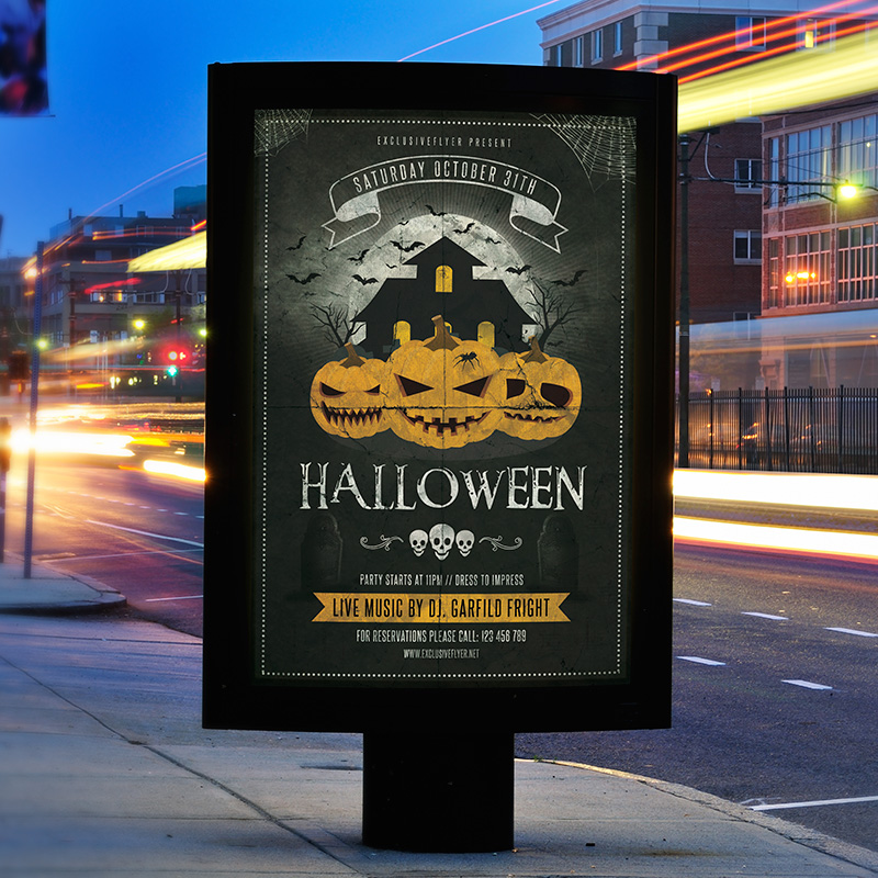 The Halloween Vol.3 is the exclusive Photoshop PSD flyer template designed by ExclusiveFlyer to promote your Halloween Party. This is a modern, stylish, Halloween flyer and just be used for a Halloween Party, Halloween Night etc. Dear customers! – you can also: Customize any flyers or Hire Us to create any unique product. Also, you can get unlimited access to all our templates. You can buy 1 month membership, 3 or 6 months membership or even 1 year membership plan and login on site, choose a design, click the button DOWNLOAD TEMPLATE and it’s yours. No hassle, no checkout! When you paid the template, you can find it in your personal account and of course you’ve got a message to your e-mail (maybe in spam) with link to download. Also, you can find all templates, which you buy, in your personal account! All of our flyers have a very good quality (300DPI). And it means that you just need to download one of them and make the necessary modifications such as replace the elements or choose the colors and start to invite your guests! You can order from us design of Banner Ad, Bi-Fold Brochure, Tri-Fold Brochure, Business Card, Logo, One-Sided Flyer, Two-sided Flyer or Postcard. All you need is to checkout and write us all information on our e-mail or skype. (order now). There are a lot of free flyer templates, free business card templates on our site! Also there are a lot of categories of flyers such as club flyers, seasonal flyers, sport flyers and also business flyers. You have a great choise on our site, so good luck! Don’t forget to follow our Facebook community, our page on Twitter, on Pinterest and on Tumblr and leave comments, cause we work for you! PSD is set up in 1275×1875 dimension (4″×6″ with 0,25″ bleed). The PSD file is very well organised, with color coded groups and layers named appropriately. Remember, all stock images of models and other people used only for demonstration all charms of the flyer and don’t included in the download!