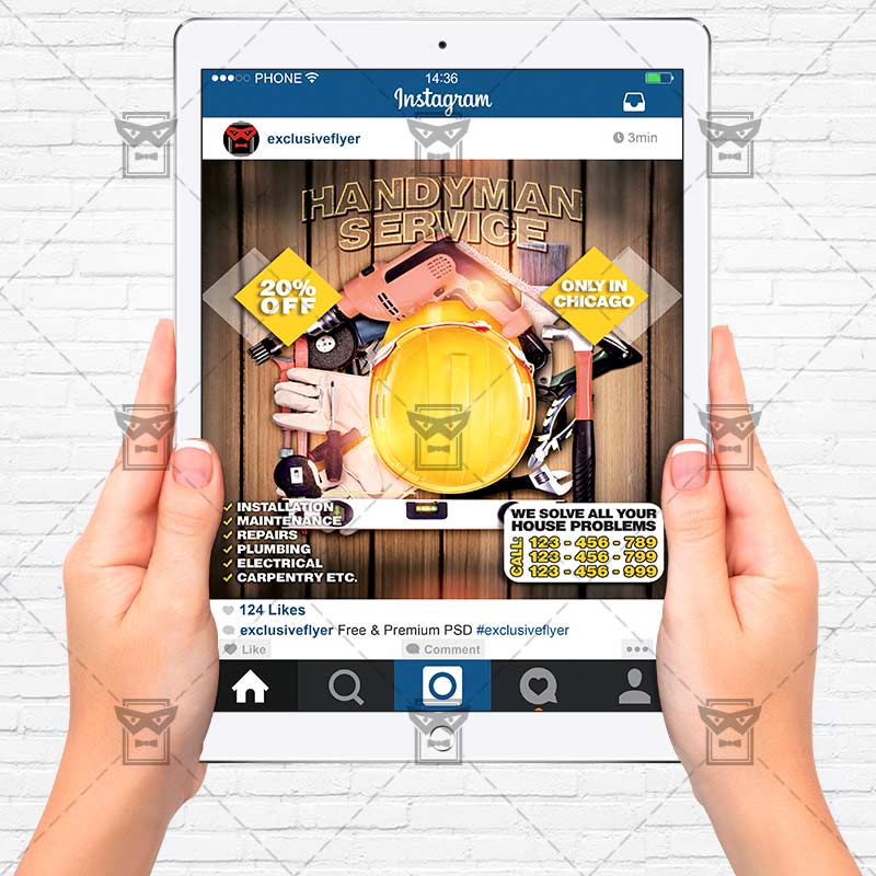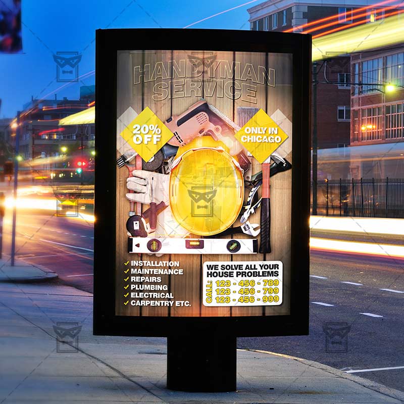 The Handyman Service is the exclusive Photoshop PSD flyer template designed by ExclusiveFlyer to promote your Handyman Service. This is a modern, stylish flyer and just be used for a Help Centre, Cleaning Agency, Handyman Agency etc. Dear customers! – you can also: Customize any flyers or Hire Us to create any unique product. Also, you can get unlimited access to all our templates. You can buy 1 month membership, 3 or 6 months membership or even 1 year membership plan and login on site, choose a design, click the button DOWNLOAD TEMPLATE and it’s yours. No hassle, no checkout! When you paid the template, you can find it in your personal account and of course you’ve got a message to your e-mail (maybe in spam) with link to download. Also, you can find all templates, which you buy, in your personal account! All of our flyers have a very good quality (300DPI). And it means that you just need to download one of them and make the necessary modifications such as replace the elements or choose the colors and start to invite your guests! You can order from us design of Banner Ad, Bi-Fold Brochure, Tri-Fold Brochure, Business Card, Logo, One-Sided Flyer, Two-sided Flyer or Postcard. All you need is to checkout and write us all information on our e-mail or skype. (order now). There are a lot of free flyer templates, free business card templates on our site! Also there are a lot of categories of flyers such as club flyers, seasonal flyers, sport flyers and also business flyers. You have a great choise on our site, so good luck! Don’t forget to follow our Facebook community, our page on Twitter, on Pinterest and on Tumblr and leave comments, cause we work for you! PSD is set up in 1275×1875 dimension (4” x 6” with 0,25” bleed). The PSD file is very well organised, with color coded groups and layers named appropriately. Remember, all stock images of models and other people used only for demonstration all charms of the flyer and don’t included in the download!