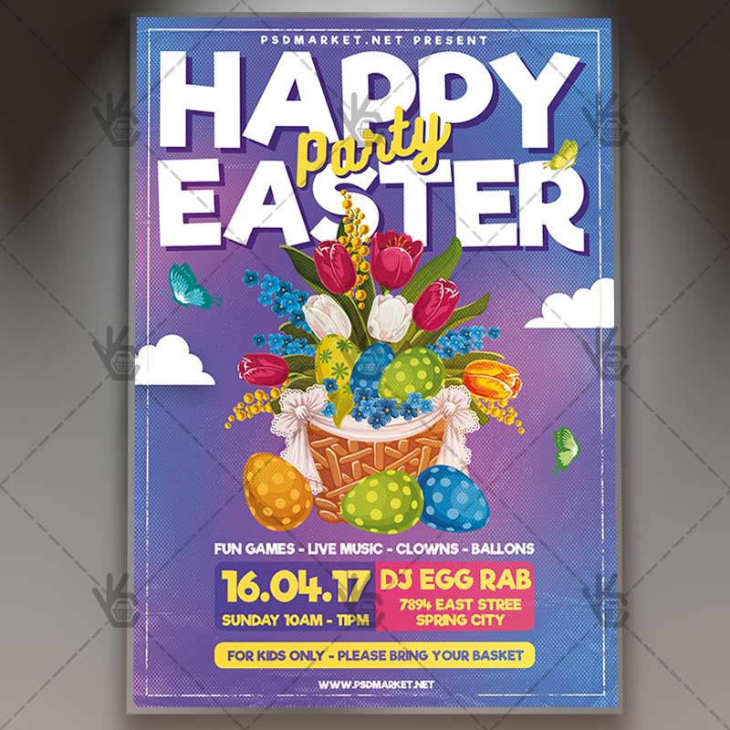 Happy Easter Party is a simply modern flyer design by PSDmarket Team to be used with Photoshop CS3 and higher. Save your time and use it for business or for your clients! This can be use for Happy Easter, Easter Night , Easter Celebration, Easter Event, Easter Egg Hunt or Egg Party and others.
