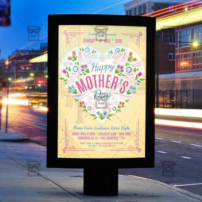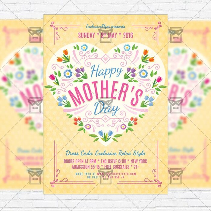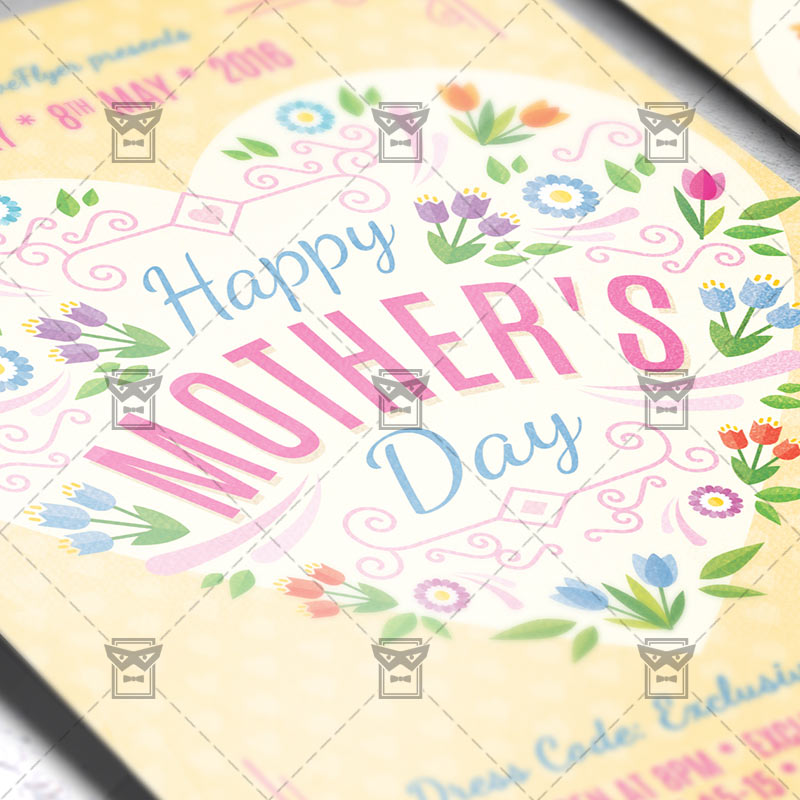 The Happy Mothers Day is the exclusive Photoshop PSD flyer template designed by ExclusiveFlyer to promote your Mothers Day Party. This is a modern, stylish flyer and just be used for a Mothers Day Brunch or Retro Spring Night etc. Dear customers! – you can also: Customize any flyers or Hire Us to create any unique product. Also, you can get unlimited access to all our templates. You can buy 1 month membership, 3 or 6 months membership or even 1 year membership plan and login on site, choose a design, click the button DOWNLOAD TEMPLATE and it’s yours. No hassle, no checkout! When you paid the template, you can find it in your personal account and of course you’ve got a message to your e-mail (maybe in spam) with link to download. Also, you can find all templates, which you buy, in your personal account! All of our flyers have a very good quality (300DPI). And it means that you just need to download one of them and make the necessary modifications such as replace the elements or choose the colors and start to invite your guests! You can order from us design of Banner Ad, Bi-Fold Brochure, Tri-Fold Brochure, Business Card, Logo, One-Sided Flyer, Two-sided Flyer or Postcard. All you need is to checkout and write us all information on our e-mail or skype. (order now). There are a lot of free flyer templates, free business card templates on our site! Also there are a lot of categories of flyers such as club flyers, seasonal flyers, sport flyers and also business flyers. You have a great choise on our site, so good luck! Don’t forget to follow our Facebook community, our page on Twitter, on Pinterest and on Tumblr and leave comments, cause we work for you! PSD is set up in 1275×1875 dimension (4” x 6” with 0,25” bleed). The PSD file is very well organised, with color coded groups and layers named appropriately. Remember, all stock images of models and other people used only for demonstration all charms of the flyer and don’t included in the download!