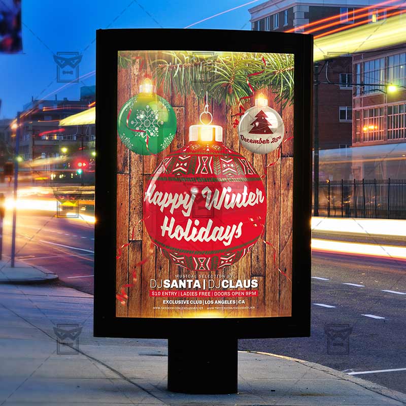 The Happy Winter Holidays is the exclusive Photoshop PSD flyer template designed by ExclusiveFlyer to promote your Happy Winter Holidays. This is a modern, stylish flyer and just be used for a Merry Christmas, Happy New Year Night etc. Dear customers! – you can also: Customize any flyers or Hire Us to create any unique product. Also, you can get unlimited access to all our templates. You can buy 1 month membership, 3 or 6 months membership or even 1 year membership plan and login on site, choose a design, click the button DOWNLOAD TEMPLATE and it’s yours. No hassle, no checkout! When you paid the template, you can find it in your personal account and of course you’ve got a message to your e-mail (maybe in spam) with link to download. Also, you can find all templates, which you buy, in your personal account! All of our flyers have a very good quality (300DPI). And it means that you just need to download one of them and make the necessary modifications such as replace the elements or choose the colors and start to invite your guests! You can order from us design of Banner Ad, Bi-Fold Brochure, Tri-Fold Brochure, Business Card, Logo, One-Sided Flyer, Two-sided Flyer or Postcard. All you need is to checkout and write us all information on our e-mail or skype. (order now). There are a lot of free flyer templates, free business card templates on our site! Also there are a lot of categories of flyers such as club flyers, seasonal flyers, sport flyers and also business flyers. You have a great choise on our site, so good luck! Don’t forget to follow our Facebook community, our page on Twitter, on Pinterest and on Tumblr and leave comments, cause we work for you! PSD is set up in 1275×1875 dimension (4” x 6” with 0,25” bleed). The PSD file is very well organised, with color coded groups and layers named appropriately. Remember, all stock images of models and other people used only for demonstration all charms of the flyer and don’t included in the download!