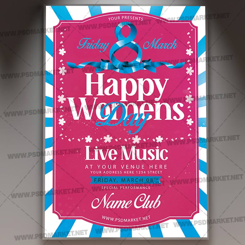 Happy Womens Day Template is a simply modern flyer design by PSDmarket Team to be used with Photoshop CS3 and higher. Save your time and use it for business or for your clients! This can be use for Happy Womens Day, Womens Day Affair, Happy Womens Day Celebration, Womens Day Celebration, Womens Party, Womens Day Event, Womens Day Party, Womens Day, Womens Day Party, Womens Night, Womens Party, Womens Day Night, International Womens Day, Girls Day, Womens Day Out or Mothers Day and others.