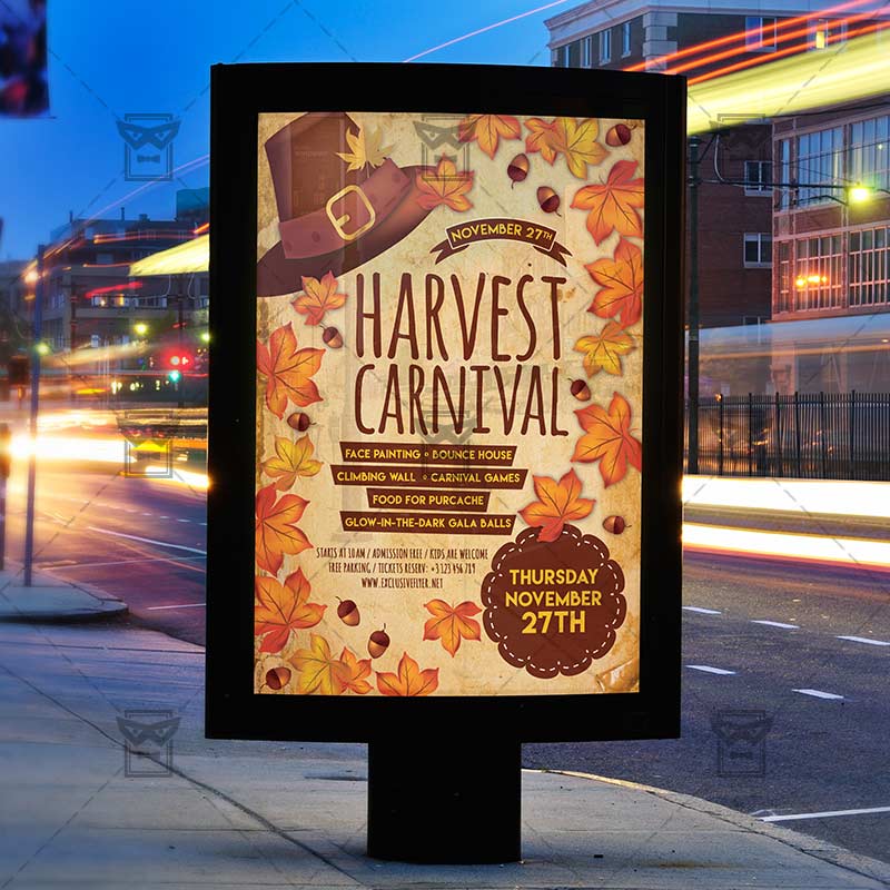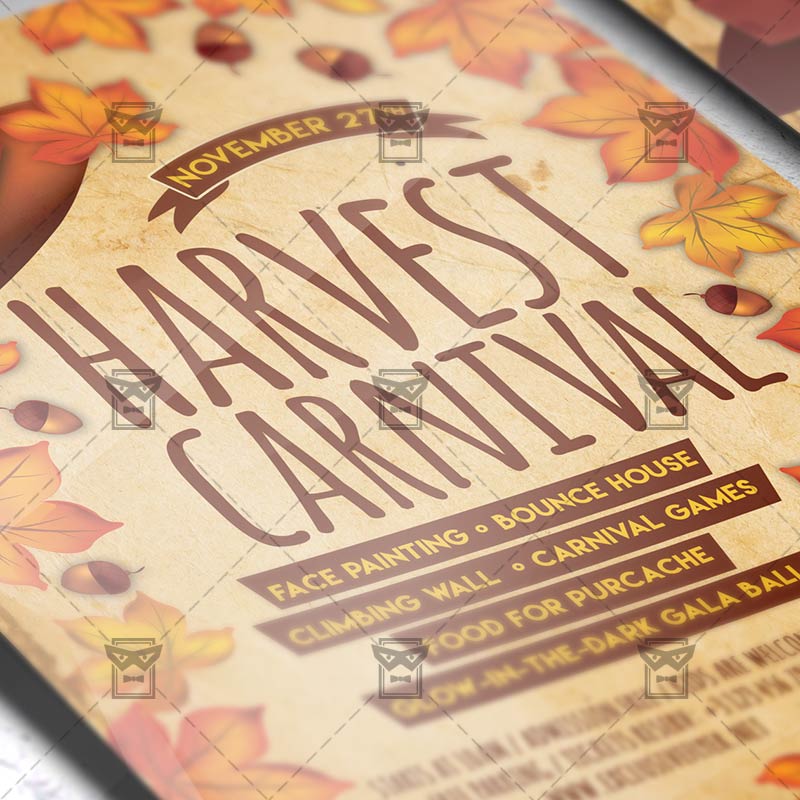 Harvest Carnival is an exclusive PSD flyer template for Adobe Photoshop designed by our best graphic designers to facilitate your task in promoting your business. With our readymade Thanksgiving flyer in psd format you can invite you customers and guest to your event or to the best Thanksgiving Party, Thanksgiving Night, Harvest November Party, Harvest Kids Carnival or Autumn Night in their lives.
