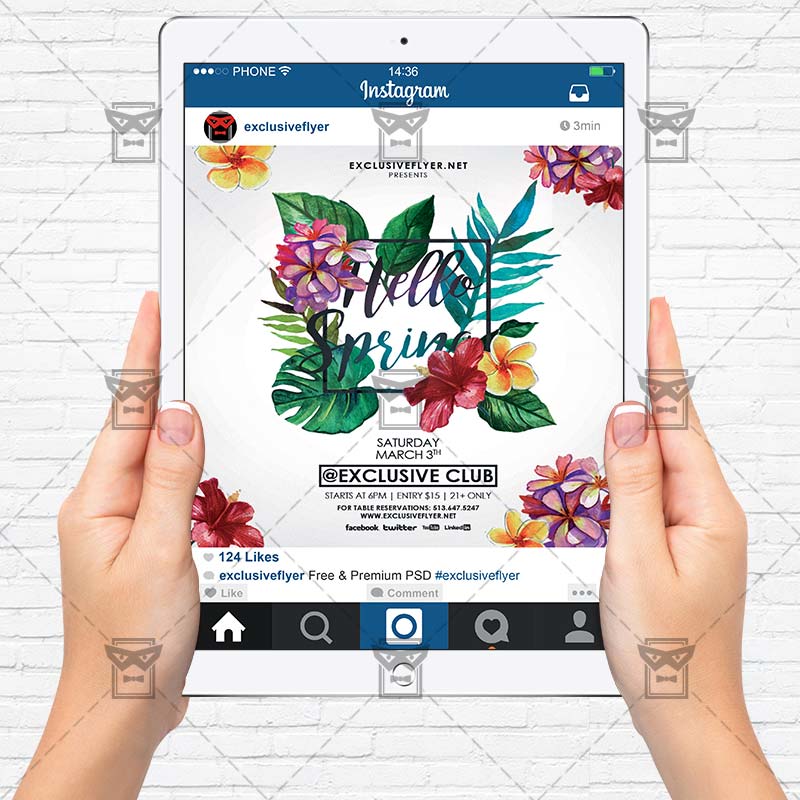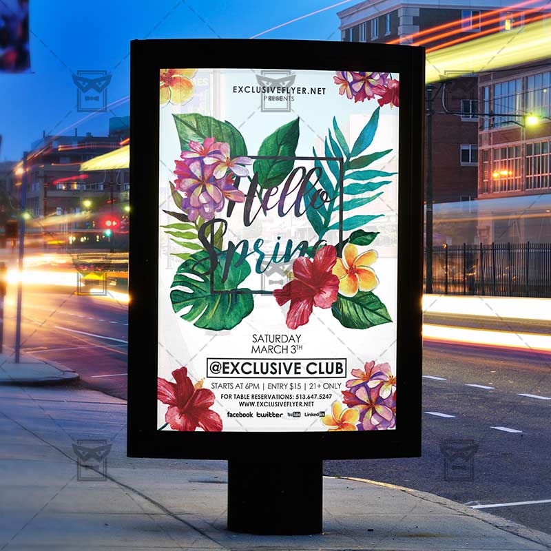 The Hello Spring is the exclusive Photoshop PSD flyer template designed by ExclusiveFlyer to promote your Hello Spring. This is a modern, stylish flyer and just be used for a Hello Spring Party, Spring Break Nightm Spring Opening Party, First Spring Party etc. Dear customers! – you can also: Customize any flyers or Hire Us to create any unique product. Also, you can get unlimited access to all our templates. You can buy 1 month membership, 3 or 6 months membership or even 1 year membership plan and login on site, choose a design, click the button DOWNLOAD TEMPLATE and it’s yours. No hassle, no checkout! When you paid the template, you can find it in your personal account and of course you’ve got a message to your e-mail (maybe in spam) with link to download. Also, you can find all templates, which you buy, in your personal account! All of our flyers have a very good quality (300DPI). And it means that you just need to download one of them and make the necessary modifications such as replace the elements or choose the colors and start to invite your guests! You can order from us design of Banner Ad, Bi-Fold Brochure, Tri-Fold Brochure, Business Card, Logo, One-Sided Flyer, Two-sided Flyer or Postcard. All you need is to checkout and write us all information on our e-mail or skype. (order now). There are a lot of free flyer templates, free business card templates on our site! Also there are a lot of categories of flyers such as club flyers, seasonal flyers, sport flyers and also business flyers. You have a great choise on our site, so good luck! Don’t forget to follow our Facebook community, our page on Twitter, on Pinterest and on Tumblr and leave comments, cause we work for you! PSD is set up in 1275×1875 dimension (4” x 6” with 0,25” bleed). The PSD file is very well organised, with color coded groups and layers named appropriately. Remember, all stock images of models and other people used only for demonstration all charms of the flyer and don’t included in the download!