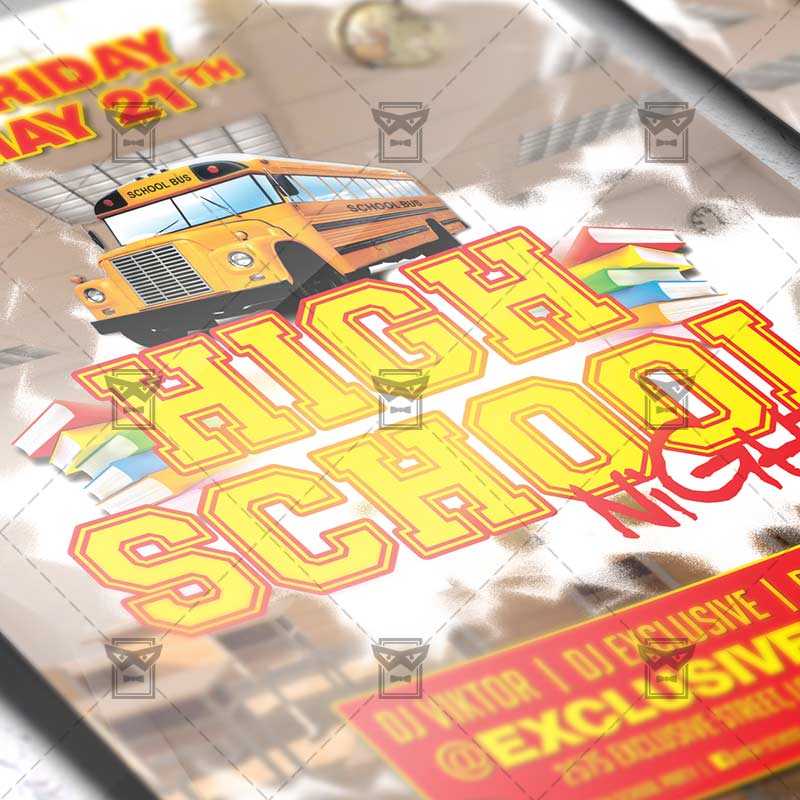 Hight School Night is an exclusive PSD flyer template for Adobe Photoshop designed by our best graphic designers to facilitate your task in promoting your business. With our readymade School flyer in psd format you can invite you customers and guest to your event or to the best College Night, Graduation Party, Prom Night or School Night Party in their lives.