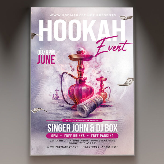 Hookah Event Flyer TemplateCreate an inviting and alluring atmosphere for your next gathering with our sophisticated **Hookah Event Flyer Template**! This elegant and atmospheric design is perfect for promoting hookah lounge nights, themed shisha parties, relaxed social gatherings, or any event where a chill vibe and aromatic flavors are the main attraction. If you’re looking to craft an irresistible invitation that whispers “relaxation,” “exotic flavors,” and “unforgettable ambiance,” this flyer template is engineered to draw a relaxed and enthusiastic crowd ready to unwind. Expect to see striking visuals, often incorporating ornate hookah pipes, swirling smoke, subtle mood lighting, comfortable seating, and elegant, inviting typography that captures the serene and communal spirit of a premium hookah event. This template is all about setting a cozy and intriguing mood, making your “Hookah Event” the ultimate destination for a sophisticated wind-down! The **Hookah Event Flyer Template** offers a highly adaptable and professional layout, ensuring you can clearly communicate all the essential details of your event while perfectly maintaining its atmospheric and inviting spirit. You can easily customize the text fields to include the specific date and time of your event, the intimate venue location, any special entry requirements or cover charges, and information about featured tobacco flavors (e.g., fruit, mint, dessert), special shisha blends, drink pairings (e.g., teas, cocktails), or live chill-out music, all presented in a clear and appealing way. Add an enticing description of what attendees can expect, perhaps highlighting opportunities for sampling new flavors, engaging in relaxed conversations, or simply enjoying the tranquil setting. Detail any exciting features like a comfortable lounge area, board games, or themed decor. And of course, include clear contact information or prominent social media handles for further engagement and reservations. Many templates also provide exciting options to incorporate additional dynamic graphics like subtle smoke trails, glowing embers, or abstract patterns, or to adjust the warm and inviting color palette (often deep reds, purples, blues, and golds) to perfectly match your brand’s aesthetic or the event’s specific relaxing theme. This lets you create a truly unique and memorable promotional piece that looks as luxurious and comfortable as your event feels. Engineered for maximum reach, the **Hookah Event Flyer Template** is designed to be both print-ready for stunning physical distribution and seamlessly optimized for digital sharing. This ensures your exciting invitation reaches a wide and enthusiastic audience. Create eye-catching physical flyers to distribute at lounges, cafes, bars, or community centers. Effortlessly share the flyer digitally through various social media channels with engaging captions that highlight the night’s tranquility, email announcements that build anticipation, and online event listings that attract those seeking a sophisticated and relaxed social experience. This dual functionality helps to maximize visibility and create significant buzz around your Hookah Event. By utilizing this distinctive and attention-grabbing flyer template, you’re not just announcing a gathering; you’re creating an invitation that broadcasts pure relaxation and promises an experience filled with aromatic flavors, soothing ambiance, and unforgettable moments, making your “Hookah Event” the ultimate destination for an epic unwind. Grab this template today and prepare to draw in a refined crowd! — Features of the Hookah Event Flyer Template