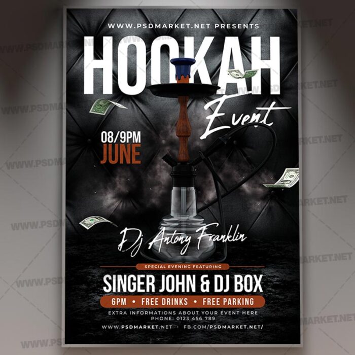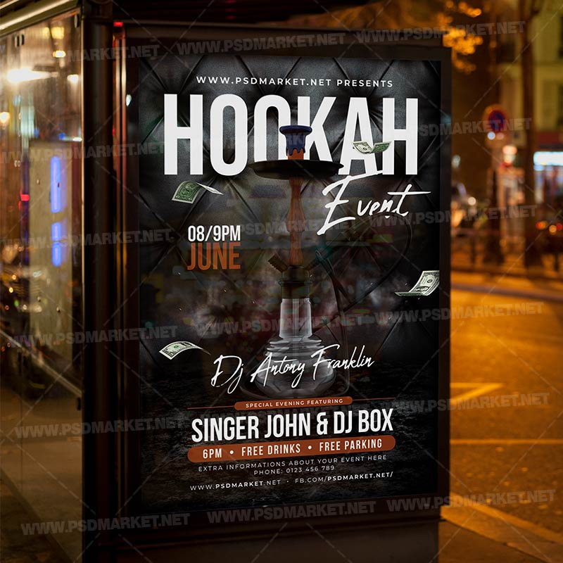 Hookah PSD Template Flyer is a simply modern flyer design by PSDmarket Team to be used with Adobe Photoshop CS3 and higher. Save your time and use it for business or for your clients! This can be use for for Hookah Event, Hookah Friday, Hookah Night, Hookah Night Event, Hookah Party Day, Hookah Celebration, Hookah Party Night, Hookah Party or Hookah Club Night and others.