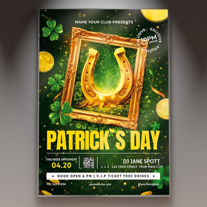 Horseshoe Patrick’s Day 2026 Flyer PSD TemplateHarness the ultimate symbol of luck and lead the charge this March with the Horseshoe Patrick’s Day 2026 Flyer PSD Template. In the high-stakes nightlife scene of 2026, a generic flyer simply won’t cut it. Your event needs a visual identity that feels both traditional and cutting-edge. This premium Photoshop template centers on the iconic golden horseshoe, surrounded by hyper-realistic 3D clovers, cinematic emerald light leaks, and high-gloss textures. It’s designed to promise your guests a night where fortune favors the bold and the party never ends. The Horseshoe Patrick’s Day 2026 Flyer PSD Template is a professional-grade asset built for rapid, high-impact customization. The fully layered PSD file is meticulously organized, allowing you to take full control of the “Lucky” atmosphere. Effortlessly update text layers to feature your headlining Celtic DJs, live bands, and venue details. Use the smart object layers to showcase 2026-exclusive perks like VIP “Golden Horseshoe” lounge access, premium Irish whiskey flights, or immersive 360-degree green laser mapping. With its high-resolution 300 DPI structure, every spark of gold and deep green shadow remains razor-sharp, ensuring a premium finish that reflects the elite standards of your brand. Optimized for a dominant digital-first marketing strategy in 2026, this template is 100% print-ready and perfectly scaled for high-engagement social media feeds. Whether you are placing high-gloss physical posters in urban hubs or launching viral TikTok and Instagram Story campaigns, this design ensures your Horseshoe Patrick’s Day branding is unforgettable. By choosing this distinctive and professional flyer, you are positioning your 2026 event as the “must-attend” destination of the season. Download the Horseshoe Patrick’s Day 2026 Flyer PSD Template today and let the luck begin! — Features of the Horseshoe Patrick’s Day 2026 Flyer PSD Template