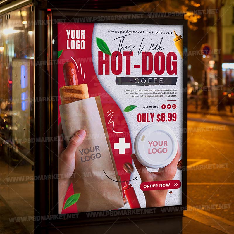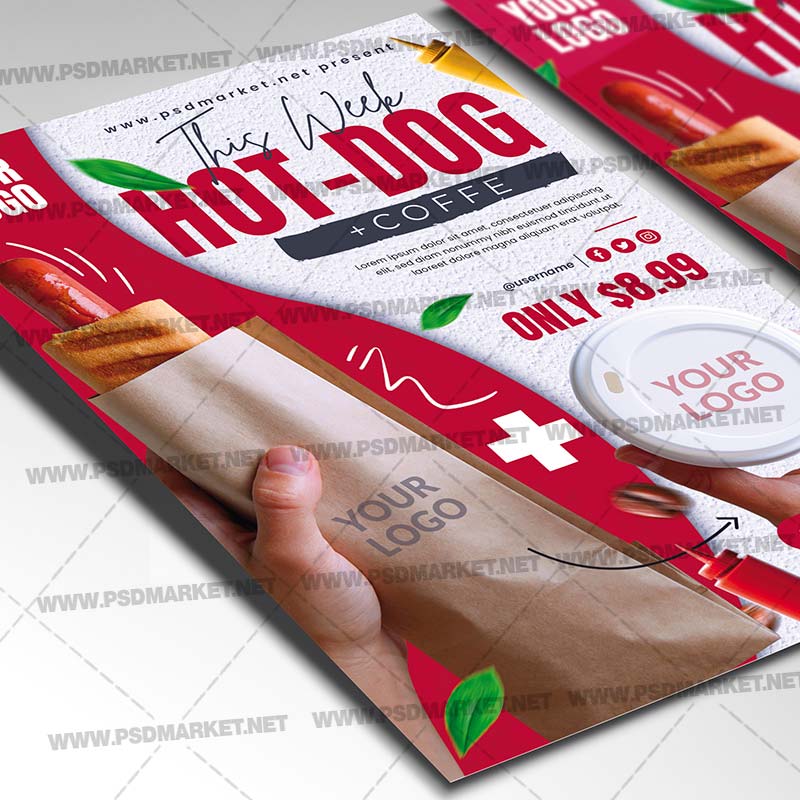 Hot Dog Coffe PSD Template Flyer is a simply modern flyer design by PSDmarket Team to be used with Photoshop CS3 and higher. Save your time and use it for business or for your clients! This can be use for Hot Dog Coffe, Hot Dog + Coffe, Burger Menu, Burger Party, Super Burger, Fast Food Show, Burger Party, Food Festival, Restaurant Menu, Food Night or Food Truck and others.