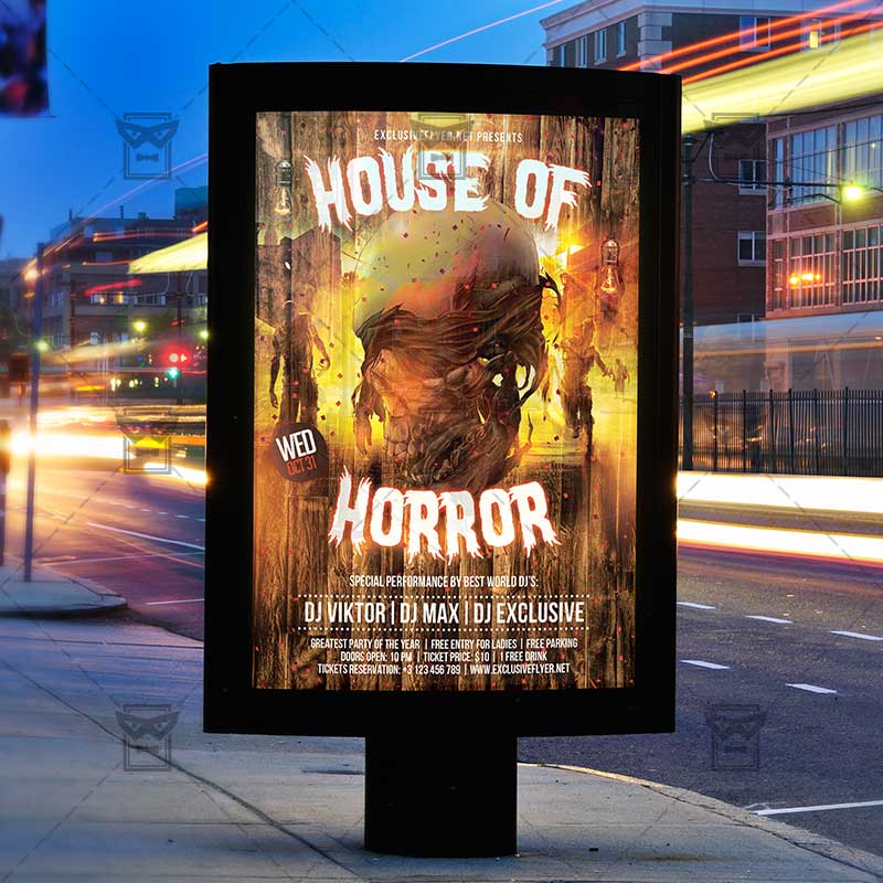 House of Horror is an exclusive PSD flyer template for Adobe Photoshop designed by our best graphic designers to facilitate your task in promoting your business. With our readymade Halloween flyer in psd format you can invite you customers and guest to your event or to the best Scary Night, Horror Party, Monster Night or Halloween Party in their lives.