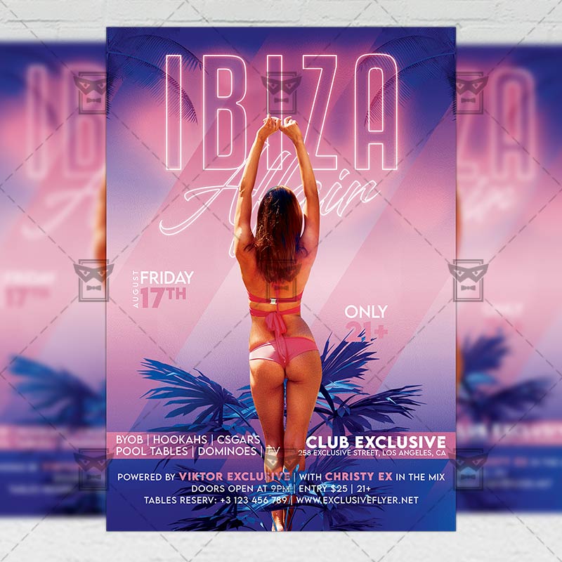 Ibiza Affair Template an exclusive PSD flyer template for Adobe Photoshop designed by our best graphic designers to facilitate your task in promoting your business. With our readymade Club flyer in psd format you can invite you customers and guest to your event or to the best Summer Party, Summer Night, Summer Affair, Ibiza Party, Ibiza Night, Summer Madness or Ibiza Crazy Night in their lives.