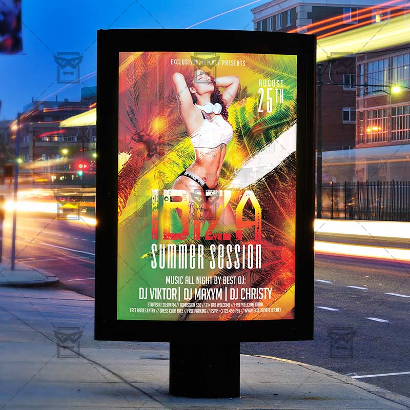 Ibiza Summer Session is an exclusive PSD flyer template for Adobe Photoshop designed by our best graphic designers to facilitate your task in promoting your business. With our readymade Summer flyer in psd format you can invite you customers and guest to your event or to the best Ibiza Party, Summer Affair Night, Beach Hot Night or Tiki Bar Party in their lives.