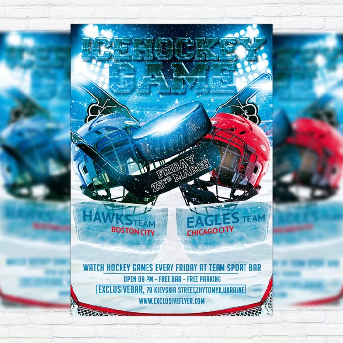 The Ice Hockey Game is the exclusive Photoshop PSD flyer template designed by ExclusiveFlyer to promote your Ice Hockey Game. This is a modern, stylish, green flyer and just be used for a Sport Party or maybe Game Night. Dear customers! – you can also: Customize any flyers or Hire Us to create any unique product. Also, you can get unlimited access to all our templates. You can buy 1 month membership, 3 or 6 months membership or even 1 year membership plan and login on site, choose a design, click the button DOWNLOAD TEMPLATE and it’s yours. No hassle, no checkout! When you paid the template, you can find it in your personal account and of course you’ve got a message to your e-mail (maybe in spam) with link to download. Also, you can find all templates, which you buy, in your personal account! All of our flyers have a very good quality (300DPI). And it means that you just need to download one of them and make the necessary modifications such as replace the elements or choose the colors and start to invite your guests! You can order from us design of Banner Ad, Bi-Fold Brochure, Tri-Fold Brochure, Business Card, Logo, One-Sided Flyer, Two-sided Flyer or Postcard. All you need is to checkout and write us all information on our e-mail or skype. (order now). There are a lot of free flyer templates, free business card templates on our site! Also there are a lot of categories of flyers such as club flyers, seasonal flyers, sport flyers and also business flyers. You have a great choise on our site, so good luck! Don’t forget to follow our Facebook community, our page on Twitter, on Pinterest and on Tumblr and leave comments, cause we work for you! PSD is set up in 1275×1875 dimension (4″×6″ with 0,25″ bleed). The PSD file is very well organised, with color coded groups and layers named appropriately. Remember, all stock images of models and other people used only for demonstration all charms of the flyer and don’t included in the download!