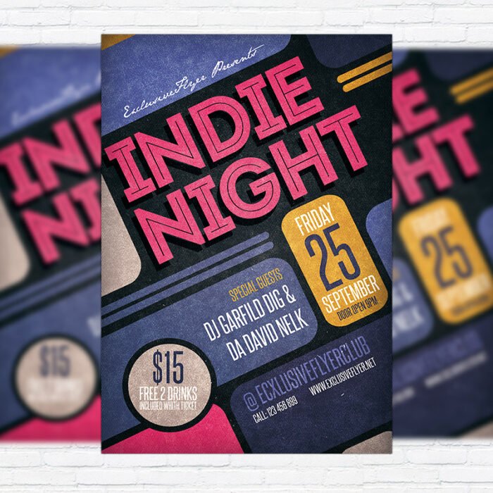 The Indie Night Vol.2 is the exclusive Photoshop PSD flyer template designed by ExclusiveFlyer to promote your Indie Night Vol.2 Party. This is a modern, stylish, fresh flyer and just be used for a Rock Party or Indie Show, or Show Party. Dear customers! – you can also: Customize any flyers or Hire Us to create any unique product. Also, you can get unlimited access to all our templates. You can buy 1 month membership, 3 or 6 months membership or even 1 year membership plan and login on site, choose a design, click the button DOWNLOAD TEMPLATE and it’s yours. No hassle, no checkout! When you paid the template, you can find it in your personal account and of course you’ve got a message to your e-mail (maybe in spam) with link to download. Also, you can find all templates, which you buy, in your personal account! All of our flyers have a very good quality (300DPI). And it means that you just need to download one of them and make the necessary modifications such as replace the elements or choose the colors and start to invite your guests! You can order from us design of Banner Ad, Bi-Fold Brochure, Tri-Fold Brochure, Business Card, Logo, One-Sided Flyer, Two-sided Flyer or Postcard. All you need is to checkout and write us all information on our e-mail or skype. (order now). There are a lot of free flyer templates, free business card templates on our site! Also there are a lot of categories of flyers such as club flyers, seasonal flyers, sport flyers and also business flyers. You have a great choise on our site, so good luck! Don’t forget to follow our Facebook community, our page on Twitter, on Pinterest and on Tumblr and leave comments, cause we work for you! PSD is set up in 1275×1875 dimension (4″×6″ with 0,25″ bleed). The PSD file is very well organised, with color coded groups and layers named appropriately. Remember, all stock images of models and other people used only for demonstration all charms of the flyer and don’t included in the download!