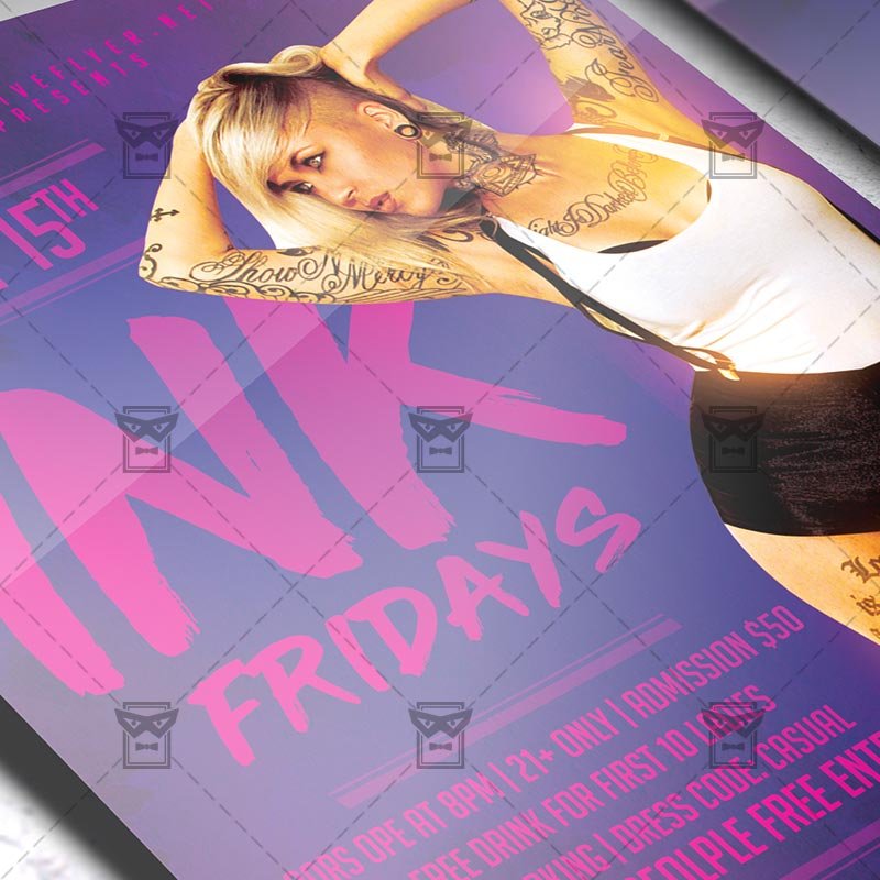 Ink Fridays an exclusive PSD flyer template for Adobe Photoshop designed by our best graphic designers to facilitate your task in promoting your business. With our readymade Club flyer in psd format you can invite you customers and guest to your event or to the best Ink Party, Tattoo Night, Tattoo Party, Tattooed Ladies Night or Tattoo Club Party in their lives.
