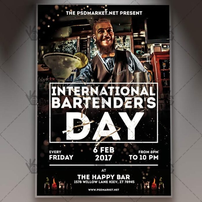 International Bartenders Day is a simply modern flyer design by PSDmarket Team to be used with Photoshop CS3 and higher. Save your time and use it for business or for your clients! This can be use for Bartenders Day, Drinks Party, Weekend Night and others.