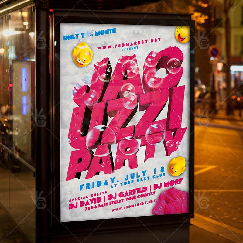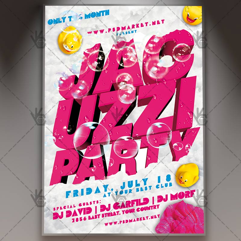 Jacuzzi Party is a simply modern flyer design by PSDmarket Team to be used with Photoshop CS3 and higher. Save your time and use it for business or for your clients! This can be use for Jacuzzi Night, Pool Party, Foam Party, Bubble Night, Foam Night, Water Night and others.
