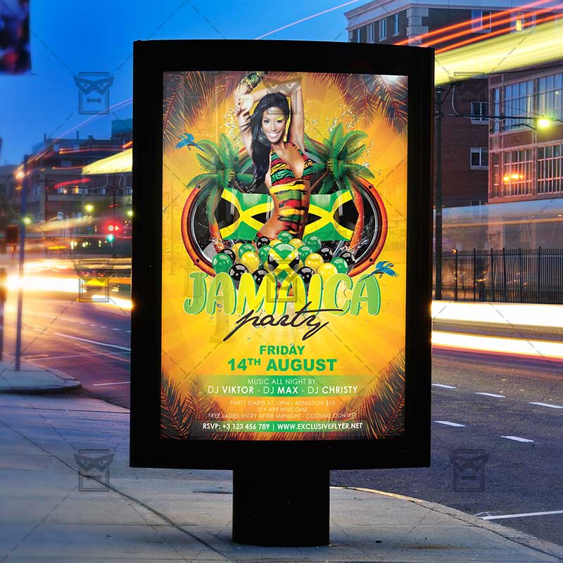 Jamaica Party is an exclusive PSD flyer template for Adobe Photoshop designed by our best graphic designers to facilitate your task in promoting your business. With our readymade Club flyer in psd format you can invite you customers and guest to your event or to the best Jamaican Party, Rasta Night or Reggae Party in their lives.