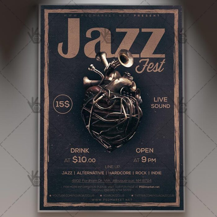Jazz Festival is a simply modern flyer design by PSDmarket Team to be used with Photoshop CS3 and higher. Save your time and use it for business or for your clients! This can be use for Jazz Night, Jazz Party, Jazz Fest, Classic Jazz, Jazz Concert, Jazz Music and others.