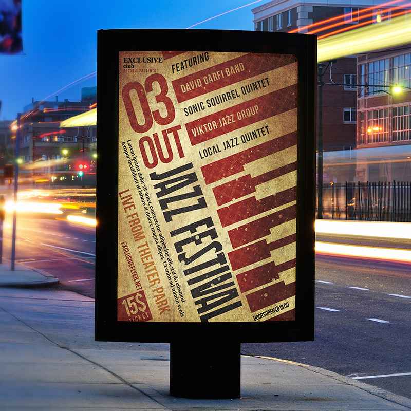 The Jazz Festival is the exclusive Photoshop PSD flyer template designed by ExclusiveFlyer to promote your Jazz Festival. This is a modern, stylish, jazz flyer and just be used for a Jazz Party or Jazz Night or Jazz Battle etc. Dear customers! – you can also: Customize any flyers or Hire Us to create any unique product. Also, you can get unlimited access to all our templates. You can buy 1 month membership, 3 or 6 months membership or even 1 year membership plan and login on site, choose a design, click the button DOWNLOAD TEMPLATE and it’s yours. No hassle, no checkout! When you paid the template, you can find it in your personal account and of course you’ve got a message to your e-mail (maybe in spam) with link to download. Also, you can find all templates, which you buy, in your personal account! All of our flyers have a very good quality (300DPI). And it means that you just need to download one of them and make the necessary modifications such as replace the elements or choose the colors and start to invite your guests! You can order from us design of Banner Ad, Bi-Fold Brochure, Tri-Fold Brochure, Business Card, Logo, One-Sided Flyer, Two-sided Flyer or Postcard. All you need is to checkout and write us all information on our e-mail or skype. (order now). There are a lot of free flyer templates, free business card templates on our site! Also there are a lot of categories of flyers such as club flyers, seasonal flyers, sport flyers and also business flyers. You have a great choise on our site, so good luck! Don’t forget to follow our Facebook community, our page on Twitter, on Pinterest and on Tumblr and leave comments, cause we work for you! PSD is set up in 1275×1875 dimension (4″×6″ with 0,25″ bleed). The PSD file is very well organised, with color coded groups and layers named appropriately. Remember, all stock images of models and other people used only for demonstration all charms of the flyer and don’t included in the download!