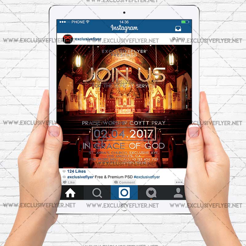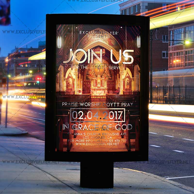 The Join Us For Sunday Service is the exclusive Photoshop PSD flyer template designed by ExclusiveFlyer to promote your Join Us For Sunday Service. This is a modern, stylish flyer and just be used for a Church Conference, Christian Conference, Gospel etc. Dear customers! – you can also: Customize any flyers or Hire Us to create any unique product. Also, you can get unlimited access to all our templates. You can buy 1 month membership, 3 or 6 months membership or even 1 year membership plan and login on site, choose a design, click the button DOWNLOAD TEMPLATE and it’s yours. No hassle, no checkout! When you paid the template, you can find it in your personal account and of course you’ve got a message to your e-mail (maybe in spam) with link to download. Also, you can find all templates, which you buy, in your personal account! All of our flyers have a very good quality (300DPI). And it means that you just need to download one of them and make the necessary modifications such as replace the elements or choose the colors and start to invite your guests! You can order from us design of Banner Ad, Bi-Fold Brochure, Tri-Fold Brochure, Business Card, Logo, One-Sided Flyer, Two-sided Flyer or Postcard. All you need is to checkout and write us all information on our e-mail or skype. (order now). There are a lot of free flyer templates, free business card templates on our site! Also there are a lot of categories of flyers such as club flyers, seasonal flyers, sport flyers and also business flyers. You have a great choise on our site, so good luck! Don’t forget to follow our Facebook community, our page on Twitter, on Pinterest and on Tumblr and leave comments, cause we work for you! PSD is set up in 1819×2551 dimension. The PSD file is very well organised, with color coded groups and layers named appropriately. Remember, all stock images of models and other people used only for demonstration all charms of the flyer and don’t included in the download!