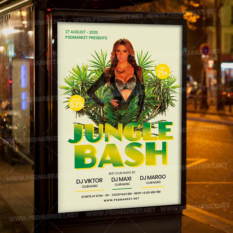 Jungle Bash Flyer is a simply modern flyer design by PSDmarket Team to be used with Photoshop CS3 and higher. Save your time and use it for business or for your clients! This can be use for Summer Party, Summer Vibes, Summer Madness Party, Summer Night, Summer Time Party, Club Summer Party, Summer Dj Night, Summer Ibiza Party and others.