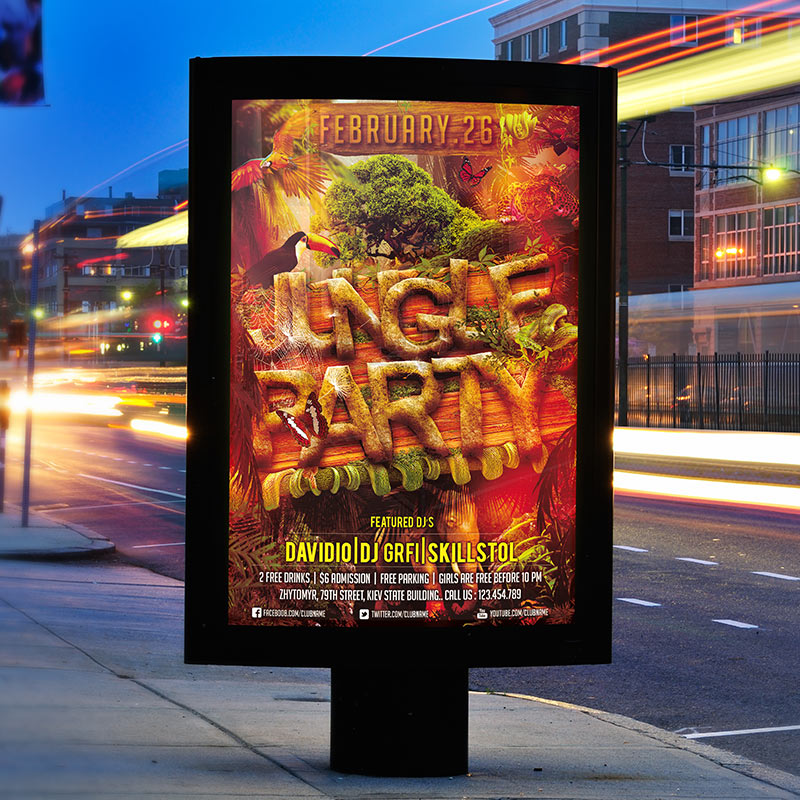 The Jungle Party is the exclusive Photoshop PSD flyer template designed by ExclusiveFlyer to promote your Jungle Party. This is a modern, stylish flyer and just be used for a Jungle Party or Jungle Night. Dear customers! – you can also: Customize any flyers or Hire Us to create any unique product. Also, you can get unlimited access to all our templates. You can buy 1 month membership, 3 or 6 months membership or even 1 year membership plan and login on site, choose a design, click the button DOWNLOAD TEMPLATE and it’s yours. No hassle, no checkout! When you paid the template, you can find it in your personal account and of course you’ve got a message to your e-mail (maybe in spam) with link to download. Also, you can find all templates, which you buy, in your personal account! All of our flyers have a very good quality (300DPI). And it means that you just need to download one of them and make the necessary modifications such as replace the elements or choose the colors and start to invite your guests! You can order from us design of Banner Ad, Bi-Fold Brochure, Tri-Fold Brochure, Business Card, Logo, One-Sided Flyer, Two-sided Flyer or Postcard. All you need is to checkout and write us all information on our e-mail or skype. (order now). There are a lot of free flyer templates, free business card templates on our site! Also there are a lot of categories of flyers such as club flyers, seasonal flyers, sport flyers and also business flyers. You have a great choise on our site, so good luck! Don’t forget to follow our Facebook community, our page on Twitter, on Pinterest and on Tumblr and leave comments, cause we work for you! PSD is set up in 1275×1875 dimension (4″×6″ with 0,25″ bleed). The PSD file is very well organised, with color coded groups and layers named appropriately. Remember, all stock images of models and other people used only for demonstration all charms of the flyer and don’t included in the download!