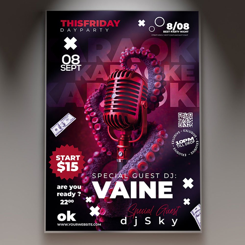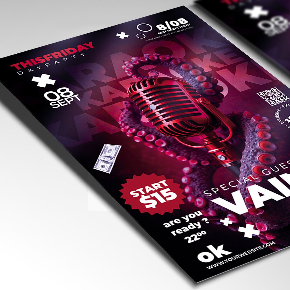 Karaoke Event Flyer PSD TemplateUnleash your inner superstar and command the stage! Our Karaoke Event Flyer PSD Template is a professional-grade design solution crafted for bar owners, event coordinators, and party planners who want to host a high-caliber singing competition or a casual sing-along night. This template moves beyond basic designs, offering a premium aesthetic that captures the glamour and excitement of a live performance. If you are looking to create an invitation that says “The Ultimate Stage Experience,” “Show Off Your Talent,” or “The Most Entertaining Event of the Season,” this PSD template is your ideal marketing tool. Expect high-impact visuals featuring cinematic 3D microphones, sparkling stage lights, and modern, bold typography. The color palette—typically a sophisticated blend of deep purples, electric pinks, and vibrant gold accents—perfectly sets the atmosphere for a professional Karaoke Event. The Karaoke Event Flyer PSD Template features a highly adaptable and professional layout, ensuring that your event’s specific details are presented with total clarity. As a fully editable Photoshop file, it allows for seamless customization of every layer. You can easily update the text fields for your venue name, date, time, and entry requirements, or highlight exclusive event features like cash prizes for winners, professional-grade sound systems, “buy-one-get-one” cocktail specials, or a guest celebrity host. Whether you are organizing a corporate team-building night, a romantic Valentine’s duet evening, or a recurring weekly competition, the organized structure of this PSD makes editing fast and intuitive. Because it is a high-resolution file, you can fine-tune the shadows, adjust the neon glows, and modify background textures to ensure your Karaoke Event promotion looks as polished and prestigious as a televised talent show. Designed for the modern marketing landscape of 2026, the Karaoke Event Flyer PSD Template is 100% print-ready and perfectly optimized for digital sharing. You can produce high-quality, physical posters to attract local foot traffic while also exporting perfectly sized versions for Instagram, Facebook, and TikTok. This ensures your message reaches a wide, fun-loving audience across all platforms, driving reservations and building massive anticipation. By choosing this distinctive and professional flyer template, you aren’t just announcing a party; you’re promising an immersive audio-visual journey. Make your “Karaoke Event” the essential destination for performers and fans alike. Download this premium template today and start your promotion with a design that hits all the right notes! — Features of the Karaoke Event Flyer PSD Template