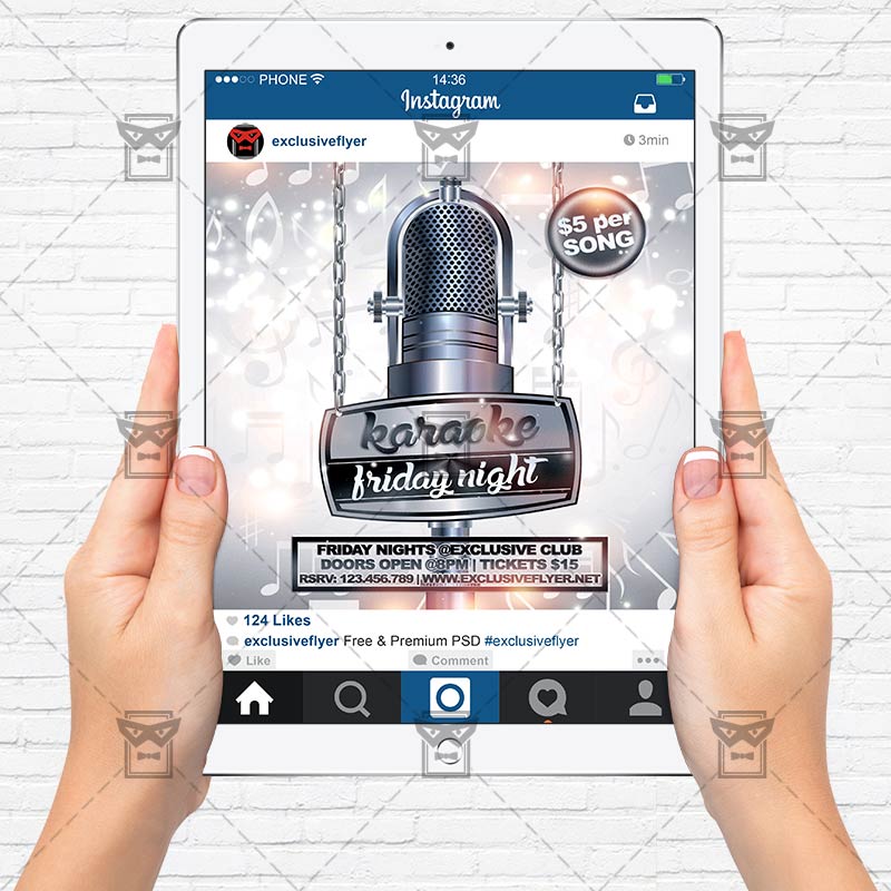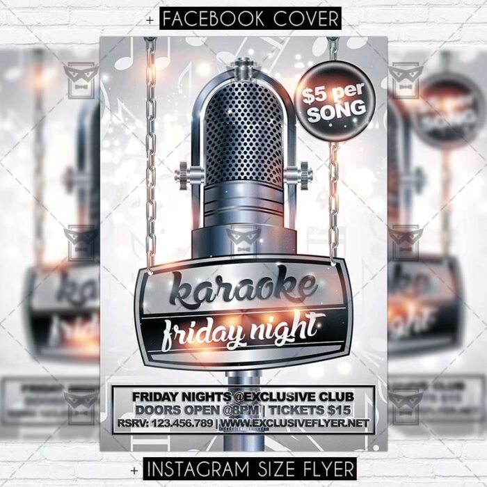 The Karaoke Friday Night is the exclusive Photoshop PSD flyer template designed by ExclusiveFlyer to promote your Karaoke Friday Night. This is a modern, stylish flyer and just be used for a Karaoke Party, Karaoke Night, Music Night, Friday Night etc. Dear customers! – you can also: Customize any flyers or Hire Us to create any unique product. Also, you can get unlimited access to all our templates. You can buy 1 month membership, 3 or 6 months membership or even 1 year membership plan and login on site, choose a design, click the button DOWNLOAD TEMPLATE and it’s yours. No hassle, no checkout! When you paid the template, you can find it in your personal account and of course you’ve got a message to your e-mail (maybe in spam) with link to download. Also, you can find all templates, which you buy, in your personal account! All of our flyers have a very good quality (300DPI). And it means that you just need to download one of them and make the necessary modifications such as replace the elements or choose the colors and start to invite your guests! You can order from us design of Banner Ad, Bi-Fold Brochure, Tri-Fold Brochure, Business Card, Logo, One-Sided Flyer, Two-sided Flyer or Postcard. All you need is to checkout and write us all information on our e-mail or skype. (order now). There are a lot of free flyer templates, free business card templates on our site! Also there are a lot of categories of flyers such as club flyers, seasonal flyers, sport flyers and also business flyers. You have a great choise on our site, so good luck! Don’t forget to follow our Facebook community, our page on Twitter, on Pinterest and on Tumblr and leave comments, cause we work for you! PSD is set up in 1275×1875 dimension (4” x 6” with 0,25” bleed). The PSD file is very well organised, with color coded groups and layers named appropriately. Remember, all stock images of models and other people used only for demonstration all charms of the flyer and don’t included in the download!
