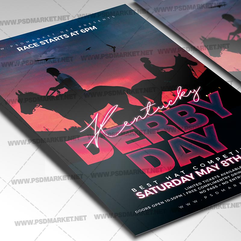 Kentucky Derby Flyer is a simply modern flyer design by PSDmarket Team to be used with Photoshop CS3 and higher. Save your time and use it for business or for your clients! This can be use for Kentucky Derby, Derby, Crazy Horse, Derby Party, Derby Night, Derby Horse Championships, Grand Derby, Horse Race, Horse Racing Championships or Horse Derby and others.
