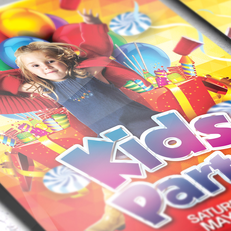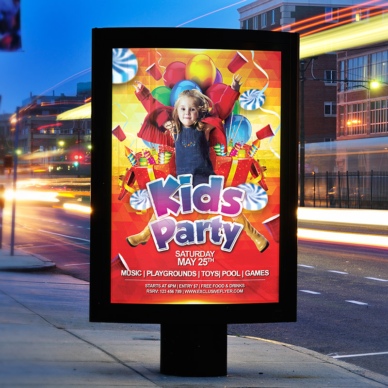 The Kids Party is the exclusive Photoshop PSD flyer template designed by ExclusiveFlyer to promote your Kids Party. This is a modern, stylish flyer and just be used for a Kids Party or Kids Birthday Party or Birthday Night etc. Dear customers! – you can also: Customize any flyers or Hire Us to create any unique product. Also, you can get unlimited access to all our templates. You can buy 1 month membership, 3 or 6 months membership or even 1 year membership plan and login on site, choose a design, click the button DOWNLOAD TEMPLATE and it’s yours. No hassle, no checkout! When you paid the template, you can find it in your personal account and of course you’ve got a message to your e-mail (maybe in spam) with link to download. Also, you can find all templates, which you buy, in your personal account! All of our flyers have a very good quality (300DPI). And it means that you just need to download one of them and make the necessary modifications such as replace the elements or choose the colors and start to invite your guests! You can order from us design of Banner Ad, Bi-Fold Brochure, Tri-Fold Brochure, Business Card, Logo, One-Sided Flyer, Two-sided Flyer or Postcard. All you need is to checkout and write us all information on our e-mail or skype. (order now). There are a lot of free flyer templates, free business card templates on our site! Also there are a lot of categories of flyers such as club flyers, seasonal flyers, sport flyers and also business flyers. You have a great choise on our site, so good luck! Don’t forget to follow our Facebook community, our page on Twitter, on Pinterest and on Tumblr and leave comments, cause we work for you! PSD is set up in 1275×1875 dimension (4” x 6” with 0,25” bleed). The PSD file is very well organised, with color coded groups and layers named appropriately. Remember, all stock images of models and other people used only for demonstration all charms of the flyer and don’t included in the download!