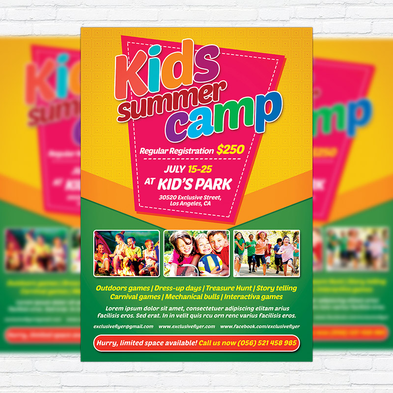 The Kids Summer Camp is the exclusive Photoshop PSD flyer template designed by ExclusiveFlyer to promote your Kids Summer Camp. This is a modern, stylish flyer and just be used for a Summer Camp or Kids Camp etc. Dear customers! – you can also: Customize any flyers or Hire Us to create any unique product. Also, you can get unlimited access to all our templates. You can buy 1 month membership, 3 or 6 months membership or even 1 year membership plan and login on site, choose a design, click the button DOWNLOAD TEMPLATE and it’s yours. No hassle, no checkout! When you paid the template, you can find it in your personal account and of course you’ve got a message to your e-mail (maybe in spam) with link to download. Also, you can find all templates, which you buy, in your personal account! All of our flyers have a very good quality (300DPI). And it means that you just need to download one of them and make the necessary modifications such as replace the elements or choose the colors and start to invite your guests! You can order from us design of Banner Ad, Bi-Fold Brochure, Tri-Fold Brochure, Business Card, Logo, One-Sided Flyer, Two-sided Flyer or Postcard. All you need is to checkout and write us all information on our e-mail or skype. (order now). There are a lot of free flyer templates, free business card templates on our site! Also there are a lot of categories of flyers such as club flyers, seasonal flyers, sport flyers and also business flyers. You have a great choise on our site, so good luck! Don’t forget to follow our Facebook community, our page on Twitter, on Pinterest and on Tumblr and leave comments, cause we work for you! PSD is set up in 1275×1875 dimension (4” x 6” with 0,25” bleed). The PSD file is very well organised, with color coded groups and layers named appropriately. Remember, all stock images of models and other people used only for demonstration all charms of the flyer and don’t included in the download!
