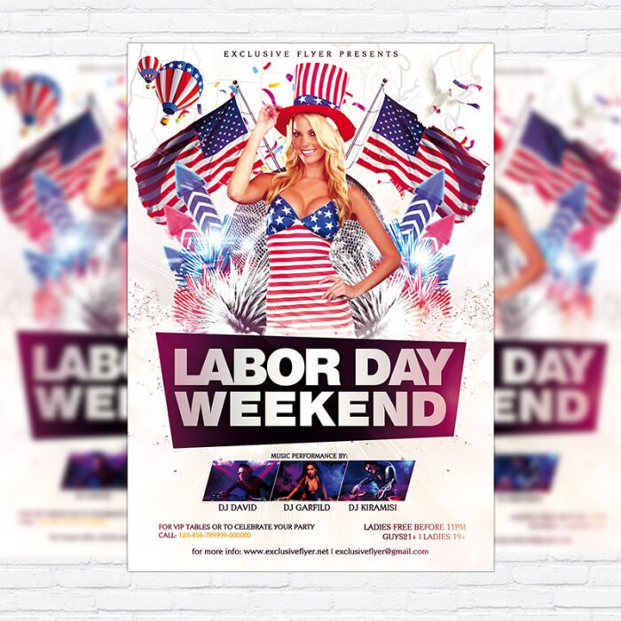 The Labor Day Weekend is the exclusive Photoshop PSD flyer/poster template designed by ExclusiveFlyer to promote your Labor Day Weekend. This is a modern, stylish, white flyer and just be used for a Memorial Night Party, 4th of july Party, American Party or Presidents Night. Dear customers! – you can also: Customize any flyers or Hire Us to create any unique product. Also, you can get unlimited access to all our templates. You can buy 1 month membership, 3 or 6 months membership or even 1 year membership plan and login on site, choose a design, click the button DOWNLOAD TEMPLATE and it’s yours. No hassle, no checkout! When you paid the template, you can find it in your personal account and of course you’ve got a message to your e-mail (maybe in spam) with link to download. Also, you can find all templates, which you buy, in your personal account! All of our flyers have a very good quality (300DPI). And it means that you just need to download one of them and make the necessary modifications such as replace the elements or choose the colors and start to invite your guests! You can order from us design of Banner Ad, Bi-Fold Brochure, Tri-Fold Brochure, Business Card, Logo, One-Sided Flyer, Two-sided Flyer or Postcard. All you need is to checkout and write us all information on our e-mail or skype. (order now). There are a lot of free flyer templates, free business card templates on our site! Also there are a lot of categories of flyers such as club flyers, seasonal flyers, sport flyers and also business flyers. You have a great choise on our site, so good luck! Don’t forget to follow our Facebook community, our page on Twitter, on Pinterest and on Tumblr and leave comments, cause we work for you! PSD is set up in 1275×1875 dimension (4″×6″ with 0,25″ bleed). The PSD file is very well organised, with color coded groups and layers named appropriately. Remember, all stock images of models and other people used only for demonstration all charms of the flyer and don’t included in the download!