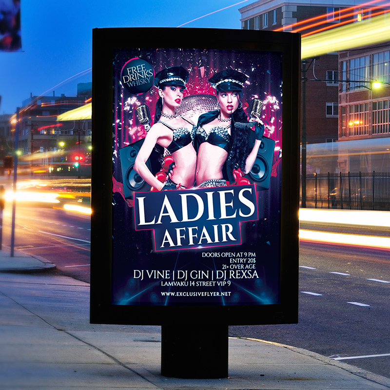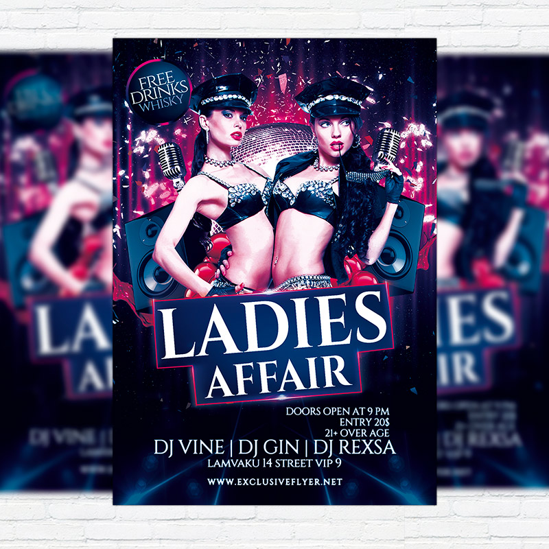 The Ladies Affair is the exclusive Photoshop PSD flyer template designed by ExclusiveFlyer to promote your Ladies Affair Party. This is a modern, stylish, perfect flyer and just be used for a Ladies Party or Ladies Night or Sexy Party etc. Dear customers! – you can also: Customize any flyers or Hire Us to create any unique product. Also, you can get unlimited access to all our templates. You can buy 1 month membership, 3 or 6 months membership or even 1 year membership plan and login on site, choose a design, click the button DOWNLOAD TEMPLATE and it’s yours. No hassle, no checkout! When you paid the template, you can find it in your personal account and of course you’ve got a message to your e-mail (maybe in spam) with link to download. Also, you can find all templates, which you buy, in your personal account! All of our flyers have a very good quality (300DPI). And it means that you just need to download one of them and make the necessary modifications such as replace the elements or choose the colors and start to invite your guests! You can order from us design of Banner Ad, Bi-Fold Brochure, Tri-Fold Brochure, Business Card, Logo, One-Sided Flyer, Two-sided Flyer or Postcard. All you need is to checkout and write us all information on our e-mail or skype. (order now). There are a lot of free flyer templates, free business card templates on our site! Also there are a lot of categories of flyers such as club flyers, seasonal flyers, sport flyers and also business flyers. You have a great choise on our site, so good luck! Don’t forget to follow our Facebook community, our page on Twitter, on Pinterest and on Tumblr and leave comments, cause we work for you! PSD is set up in 1275×1875 dimension (4″×6″ with 0,25″ bleed). The PSD file is very well organised, with color coded groups and layers named appropriately. Remember, all stock images of models and other people used only for demonstration all charms of the flyer and don’t included in the download!