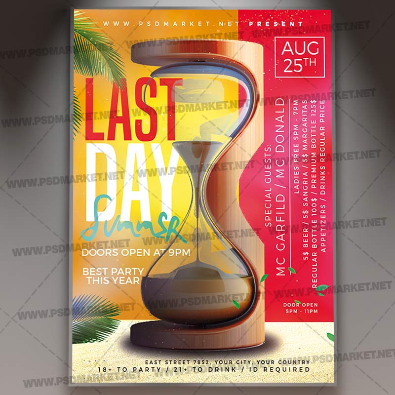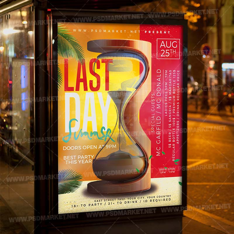 Last Day Summer Flyer is a simply modern flyer design by PSDmarket Team to be used with Photoshop CS3 and higher. Save your time and use it for business or for your clients! This can be use for Last Day Summer, End of Summer, The End of Summer Night, The End of Summer Party, The End of Summer, Summer Sale, Summer Sale Party, Summer Party , Summer Sale Night, BBQ Summer Party, Beach Party, Techno Summer Party or Summer Night and others.