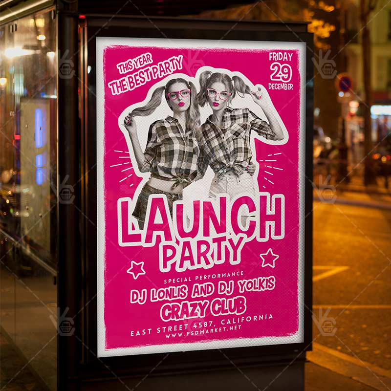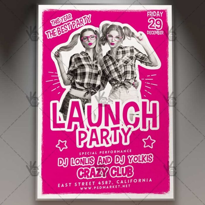 Launch Party is a simply modern flyer design by PSDmarket Team to be used with Photoshop CS3 and higher. Save your time and use it for business or for your clients! This can be use for Launch Night, Club Party, Minimal Night, Girls Night, Pink Party, Night Party or Club Event and others.