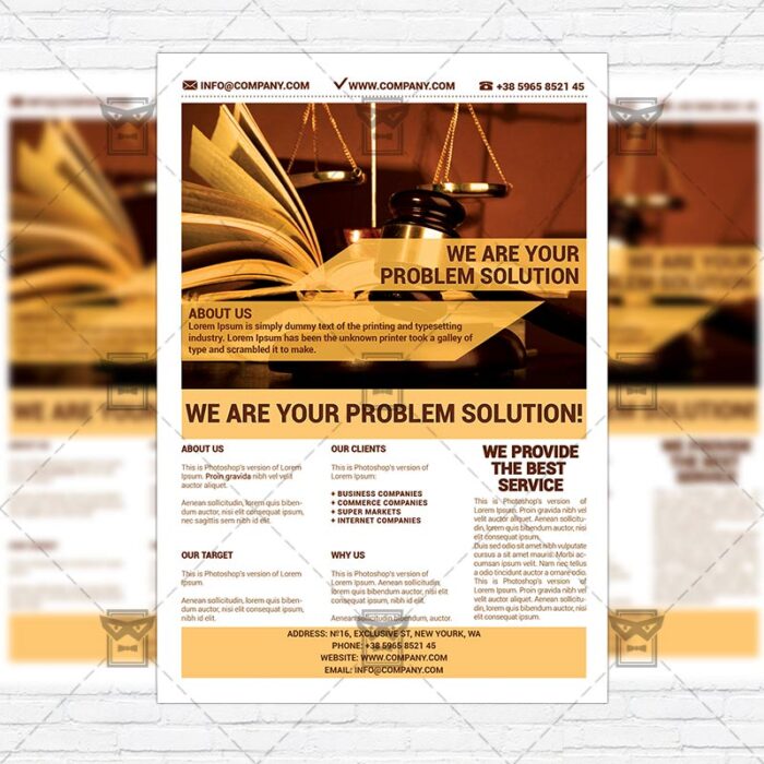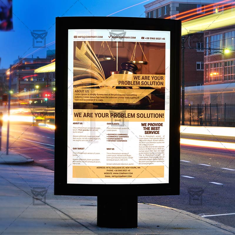 The Lawyer Company is the exclusive Photoshop PSD flyer template designed by ExclusiveFlyer to promote your Lawyer Company. This is a modern, stylish flyer and just be used for a Lawyer Firm or Notary Office etc. Dear customers! – you can also: Customize any flyers or Hire Us to create any unique product. Also, you can get unlimited access to all our templates. You can buy 1 month membership, 3 or 6 months membership or even 1 year membership plan and login on site, choose a design, click the button DOWNLOAD TEMPLATE and it’s yours. No hassle, no checkout! When you paid the template, you can find it in your personal account and of course you’ve got a message to your e-mail (maybe in spam) with link to download. Also, you can find all templates, which you buy, in your personal account! All of our flyers have a very good quality (300DPI). And it means that you just need to download one of them and make the necessary modifications such as replace the elements or choose the colors and start to invite your guests! You can order from us design of Banner Ad, Bi-Fold Brochure, Tri-Fold Brochure, Business Card, Logo, One-Sided Flyer, Two-sided Flyer or Postcard. All you need is to checkout and write us all information on our e-mail or skype. (order now). There are a lot of free flyer templates, free business card templates on our site! Also there are a lot of categories of flyers such as club flyers, seasonal flyers, sport flyers and also business flyers. You have a great choise on our site, so good luck! Don’t forget to follow our Facebook community, our page on Twitter, on Pinterest and on Tumblr and leave comments, cause we work for you! PSD is set up in 1275×1875 dimension (4” x 6” with 0,25” bleed). The PSD file is very well organised, with color coded groups and layers named appropriately. Remember, all stock images of models and other people used only for demonstration all charms of the flyer and don’t included in the download!